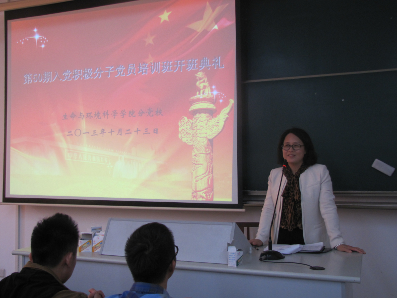 为使广大学生入党积极分子了解无产阶级思想,明确共产主义纲领,把握先进文化的前进方向, 10月23日13:30,生命与环境科学院分党校在B楼107室隆重举行第五十期入党积极分子党课培训开班典礼,并在102室开展党课培训第一讲。我院党委书记周春儿出席本次开班典礼,党建组织委员倪雅主持开班典礼。