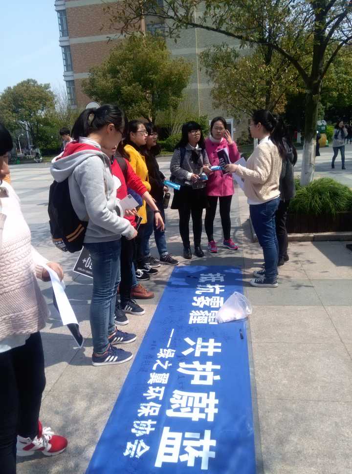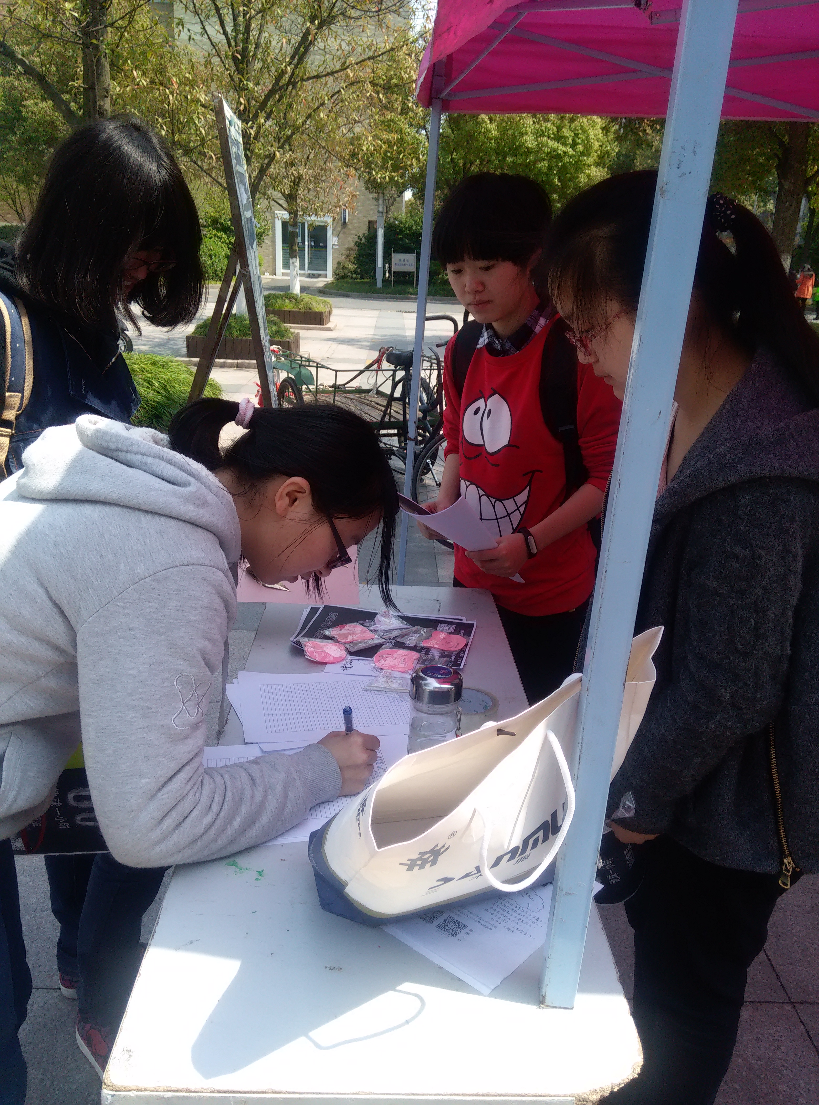 阳光微醺,在工作人员热情的宣传声中,本次宣传活动顺利地开展了。协会工作人员分为两个部分,一部分在二期广场附近进行宣传,向过往同学介绍活动内容,并引导其到帐篷处登记报名;其余工作人员在二期广场的帐篷处接待前来的同学,接受报名并引导其在横幅上签字写下承诺。
