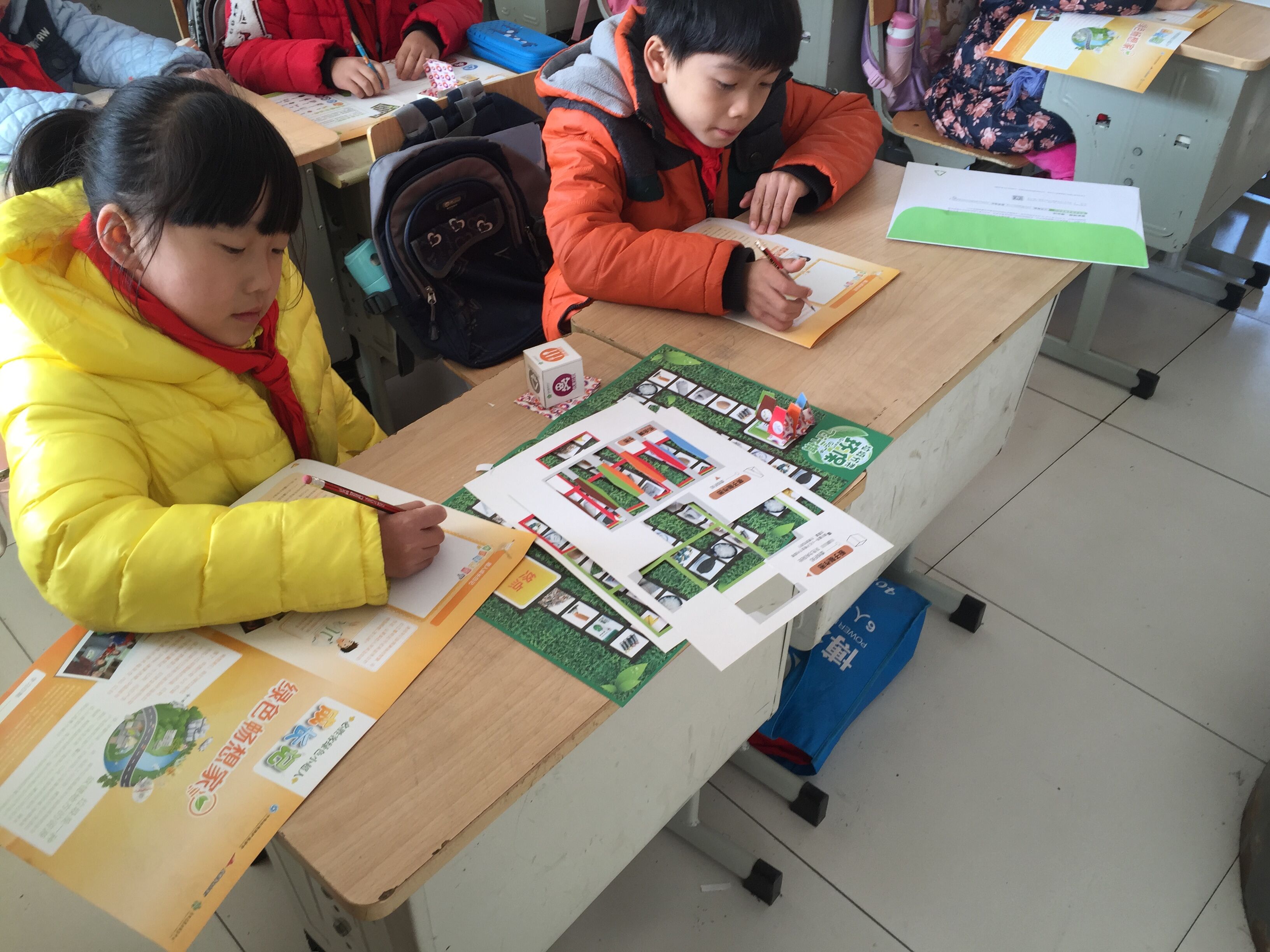 中午十二点十分,助教们便早早地到达学正小学进行课前准备。助教们分发好教材、飞行棋制作卡纸后,小朋友们便迫不及待的开始制作飞行棋。助教们一边与孩子们聊天,一边帮助他们制作。随后主讲们也到达教室,进行幻灯片的调试。调试完成后,“绿色”畅想家的教学正式开始了。