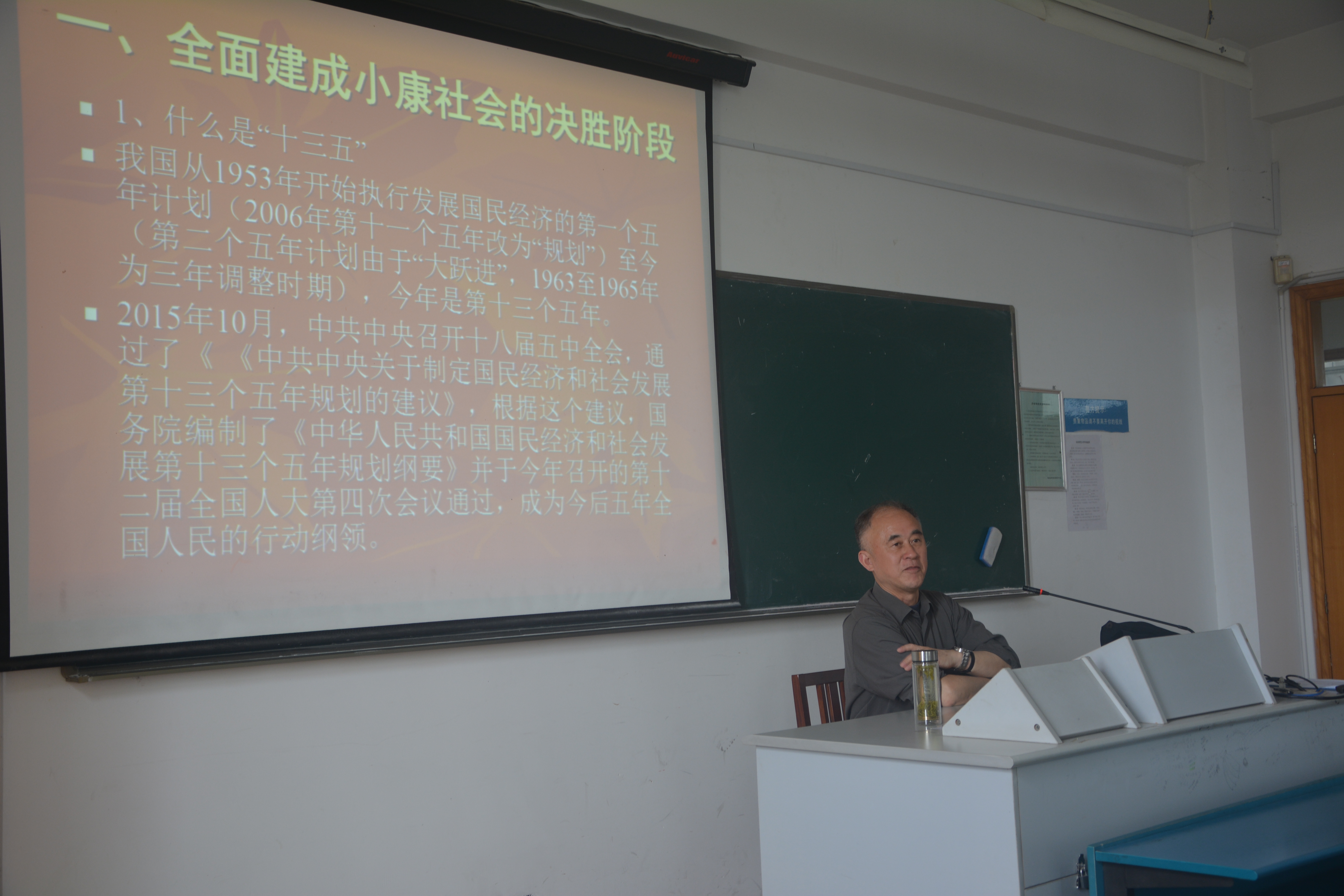 曹力铁老师此次讲座围绕党的十三五规划展开。首先,他从最初的一五计划引入主题,以亲身经历讲述了党与国家的发展往事,从而表明党在艰苦奋斗中不断进步。之后,曹老师又以生动的小视频来解述十三五规划的编制过程,五个步骤中老师尤其强调了去年的十八届五中全会中,提出了整个编制过程的关键就在于确定十三五规划的大致方向。紧接着,曹力铁老师通过各种实例,证明十三五规划集中了人民的智慧,体现了党与国家的意志。此外,“决胜”二字被老师通篇强调,中国已经到了发展最关键的时刻,但也是最困难的时刻,每个人都须齐心协力,赢得这个“决胜”。在肯定党的进步的时候,曹力铁老师也客观指出了我国目前诸多矛盾叠加,存在着风险隐患。具体表现在大力生产钢铁导致环境污染严重,注重于发展国防但核心仍待进步以及存在着进入中等收入陷阱的风险。曹力铁老师还列举了十三五规划中解决我国目前矛盾的具体方案,重心在于供给侧改革,以达到减少消费外流的情况。最后,曹力铁老师给予在场的学生美好的祝愿,鼓励年轻人创新创业,开放发展。