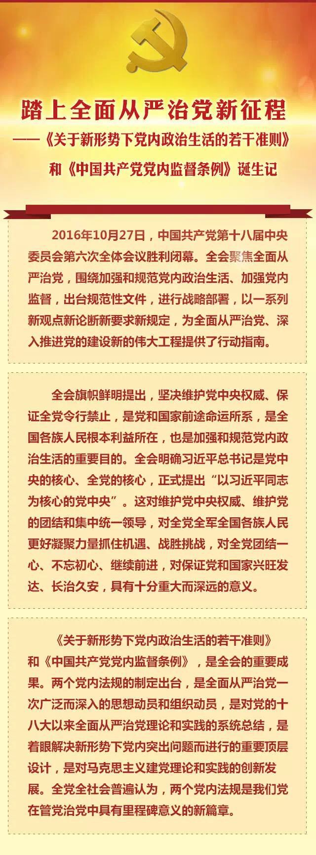 2016年2月,中央政治局作出决定,党的十八届六中全会专题研究全面从严治党问题,制定新形势下党内政治生活的若干准则,修订《中国共产党党内监督条例(试行)》,文件起草工作的大幕正式拉开。