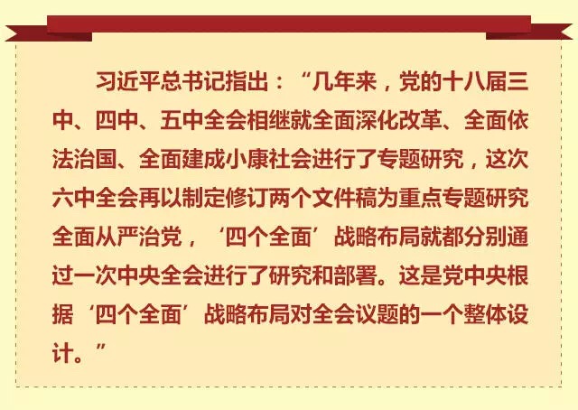 六中全会闭幕后,有外电评论:“四个全面”战略布局将中共管党治党提升到了国家发展战略的新高度;这次全会对全面从严治党作出新部署,巩固了“四个全面”战略布局治国理政总方略的地位。