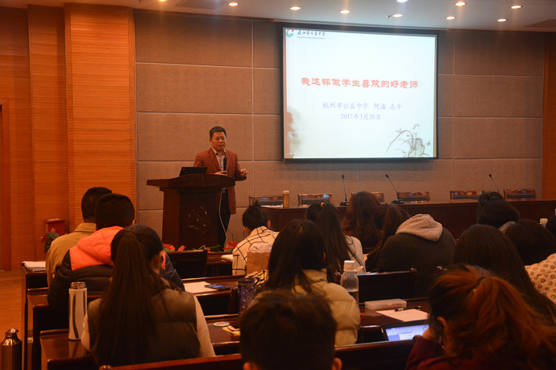 日前,杭州公益中学校长潘志平先生做客“生科问道”大讲堂,为我院本科、硕士研究生以及下沙校区其他专业师范生成功主讲了“我这样当一名学生喜欢的好老师”为主题的学术报告。潘校长以丰富的教学实践和管理经验,分享了他与学生之间的故事,诠释了如何做一位好老师、办学生喜欢的学校、做有真情的教育,博得了师生的阵阵掌声。