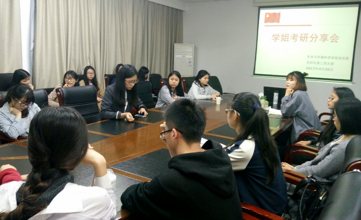 2017年4月26日星期三,我院本科生第二党支部在行政楼804召开了考研分享会,邀请了本支部三名考上研究生的党员同志,为学弟学妹们分享考研心得,支部组织委员张荃负责本次活动。