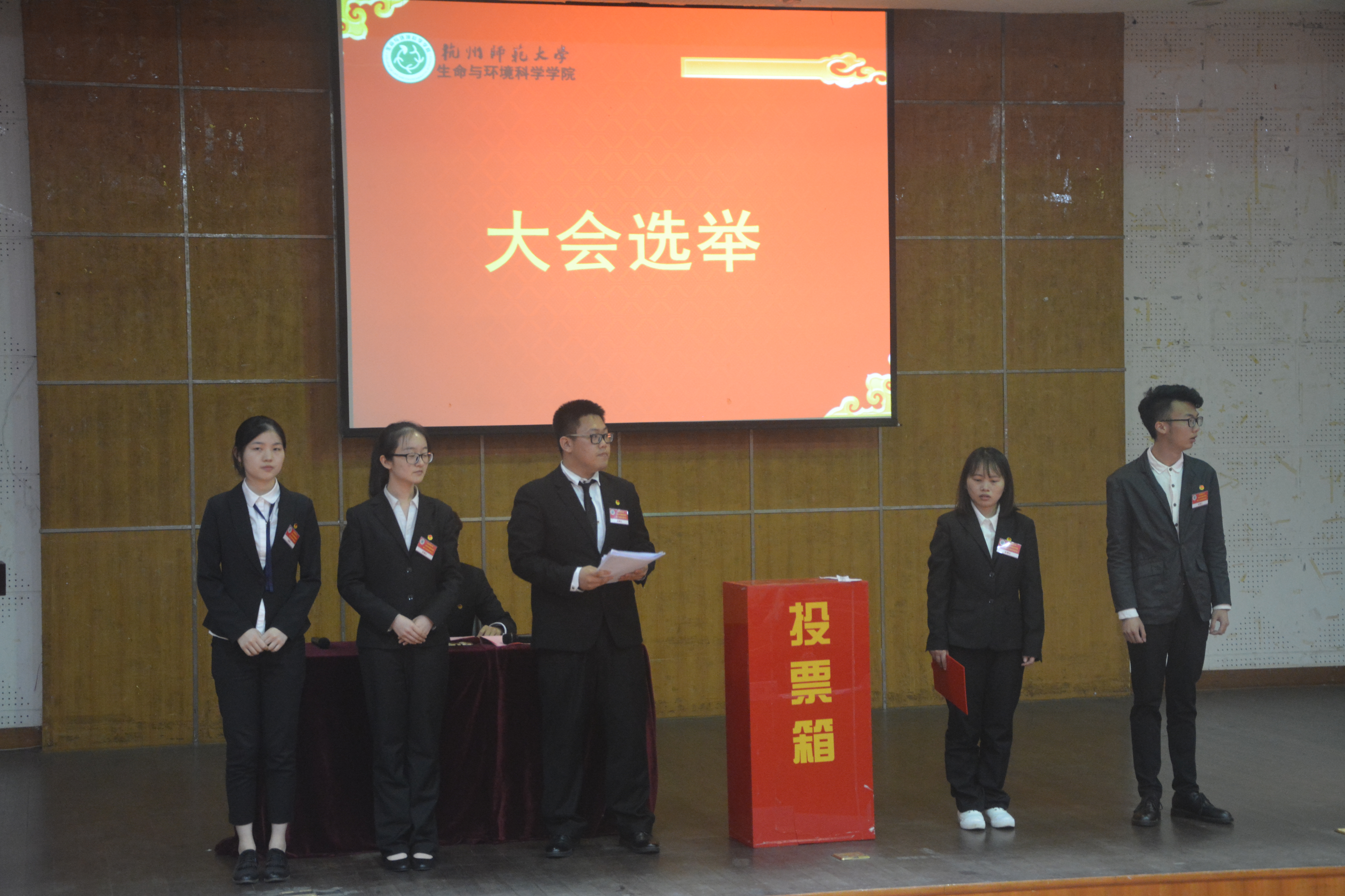会议第三阶段——候选人演讲。上台演讲的22位候选人用自己独特的方式向大家展示了他们对工作的激情与对团学联的热爱,并在演讲过程中穿插一些才艺引起阵阵笑声。在结束了精彩的候选人演讲之后,监票人开始发放选票,大会开始选举第十六次学生代表。在等待监票人统计票数的同时,胡镜宣读了2016-2017学年团委学生联合会优秀团干部和优秀学生干部名单。此次竞选成功的学生代表有:尹乔、包雪钗、吕夏晨、吕琦、许敏赟、李晓菡、陈峥峰、陈萱、邱虹凯、邵梦恩、肖文静、张琳琳、罗雨嘉、郑双芝、赵桐鹤、俞步涛、夏梦雪、谢雪曼、霍忻钰。