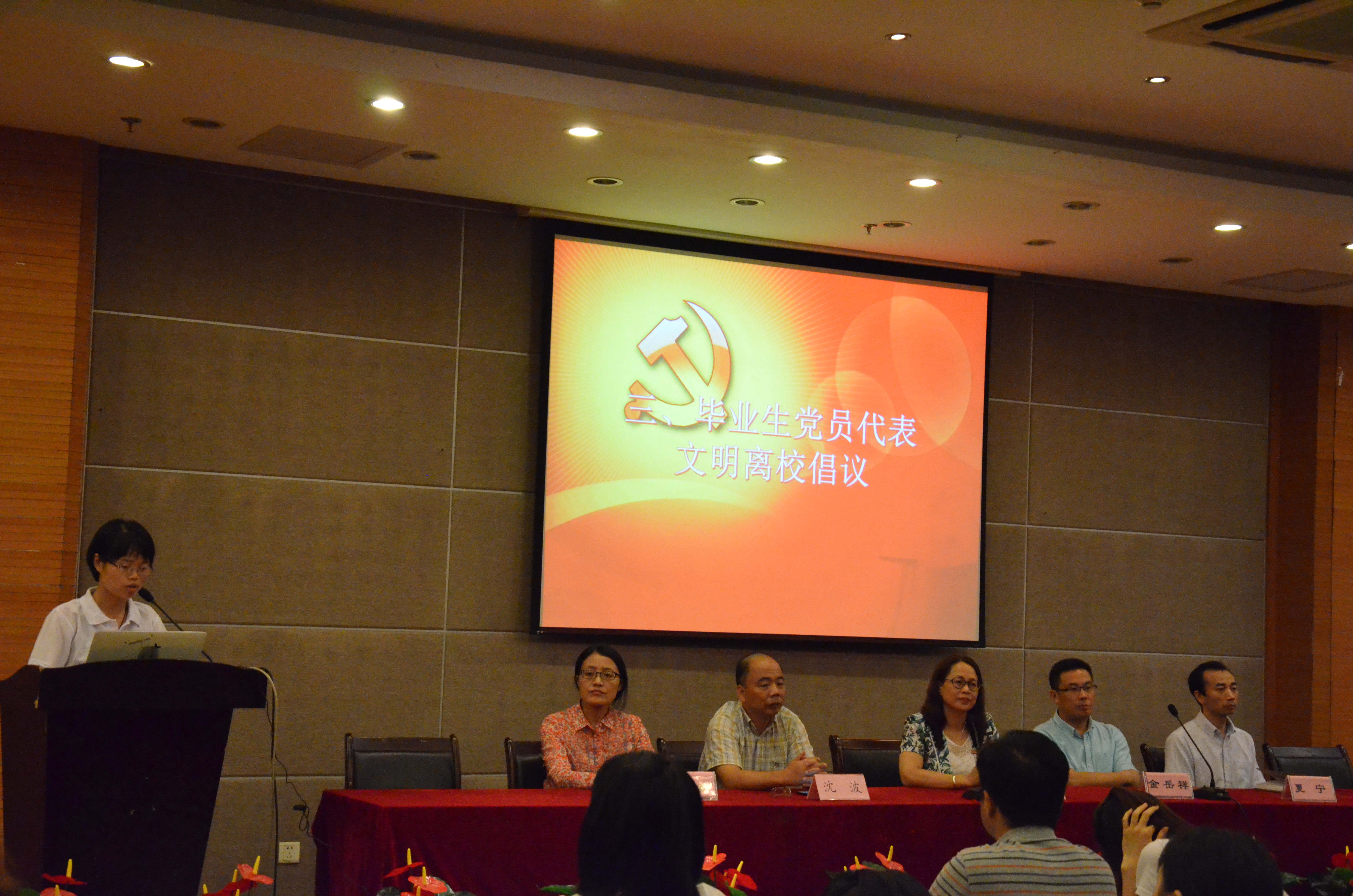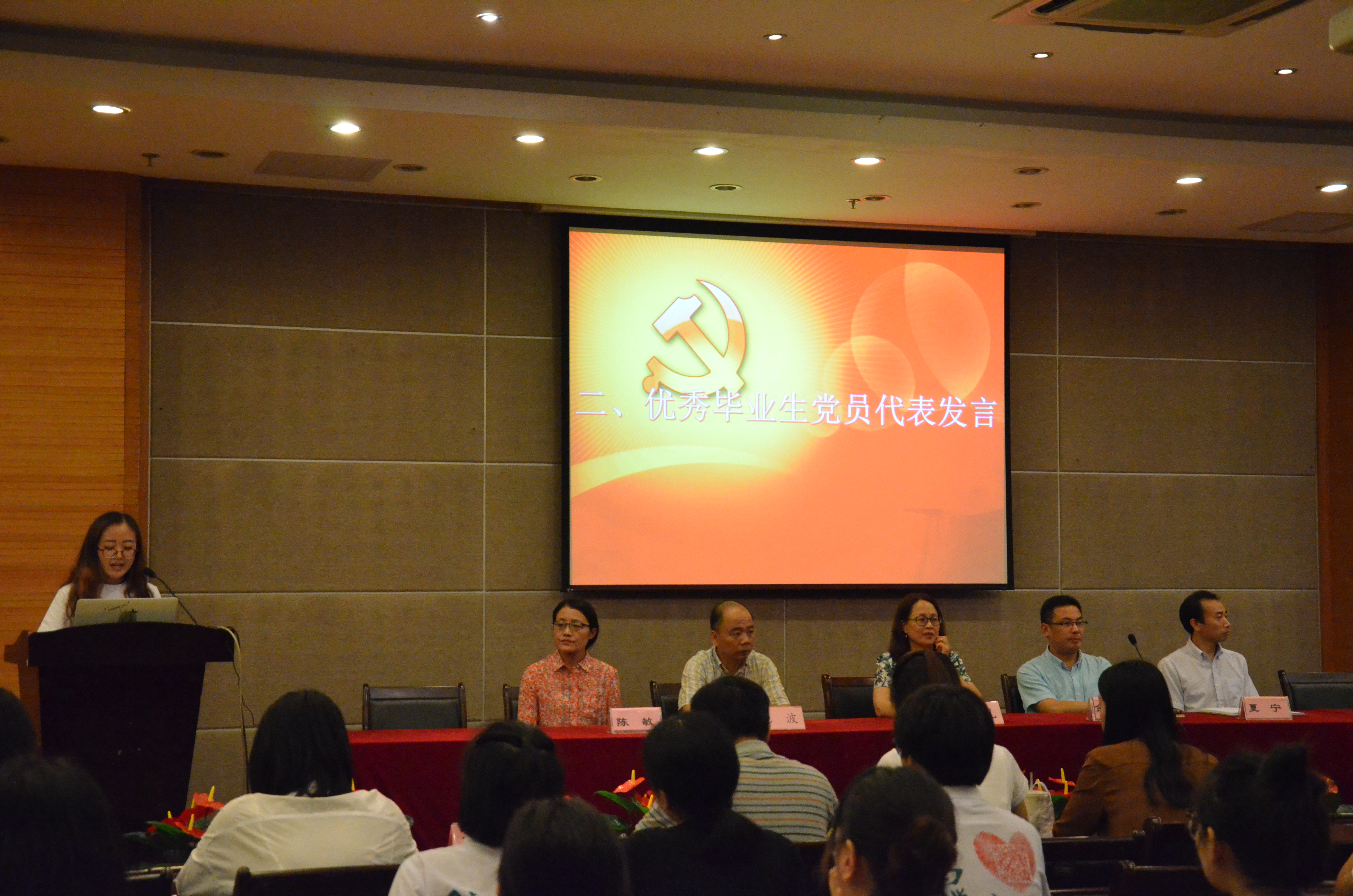 首先,全体毕业生党员在金岳祥副书记的带领下,面对党旗,重温了初次入党时许下的誓言,回忆重现,让所有在座党员再次感受了第一天入党时的激动心情,也再一次让入党誓言牢牢刻在了同学们心里。随后本科毕业生党员代表田兰馨以及研究生代表李智,各自讲述了在杭师大党员生活的点滴和感受。田兰馨讲到,大学生活就像一个熔炉,燃烧出每个与众不同的精彩人生。自己从干部到干事,从团员到党员,收获了很多,也感谢老师们一路的领导。而研究生李智则讲到无论在学校还是社会中,各位党员应始终用党的理论来武装自己,不断加强思想政治建设,提高自身的修养,不久他也要赴西藏投身志愿者工作,在未来的学习、工作中,他会不断提高自身素质与能力,不断前进。然后,陈思同学作为毕业生党员代表,发起了毕业生党员文明离校的倡议,希望2017届全体毕业生党员践行职责,做最文明的毕业生;积极总结反馈,做最理性的思考者;投身志愿活动,做最热情的奉献者;常怀感恩之心,做最有心的杭师大学子;牢记教诲,做最坚强的奋斗者。
