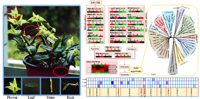 该研究组通过高通量转录组测序技术、生物信息学分析等手段,揭示了传统药用植物铁皮石斛中两种经典药效成分:石斛碱和石斛多糖的生物合成代谢途径,同时鉴定得到了大量参与石斛碱和石斛多糖合成的关键酶编码基因。尤其是针对细胞色素P450超基因家族的序列及进化分析,从分子层面上探讨了P450基因在药用植物有效成分生物合成途径中的作用。在克隆得到的众多关键基因中,部分基因属首次在药用植物中被报导。该研究成果为人们理解铁皮石斛药用成分的生物合成机制提供了大量有价值的遗传信息,同时,为铁皮石斛种质改良提供了理论指导。