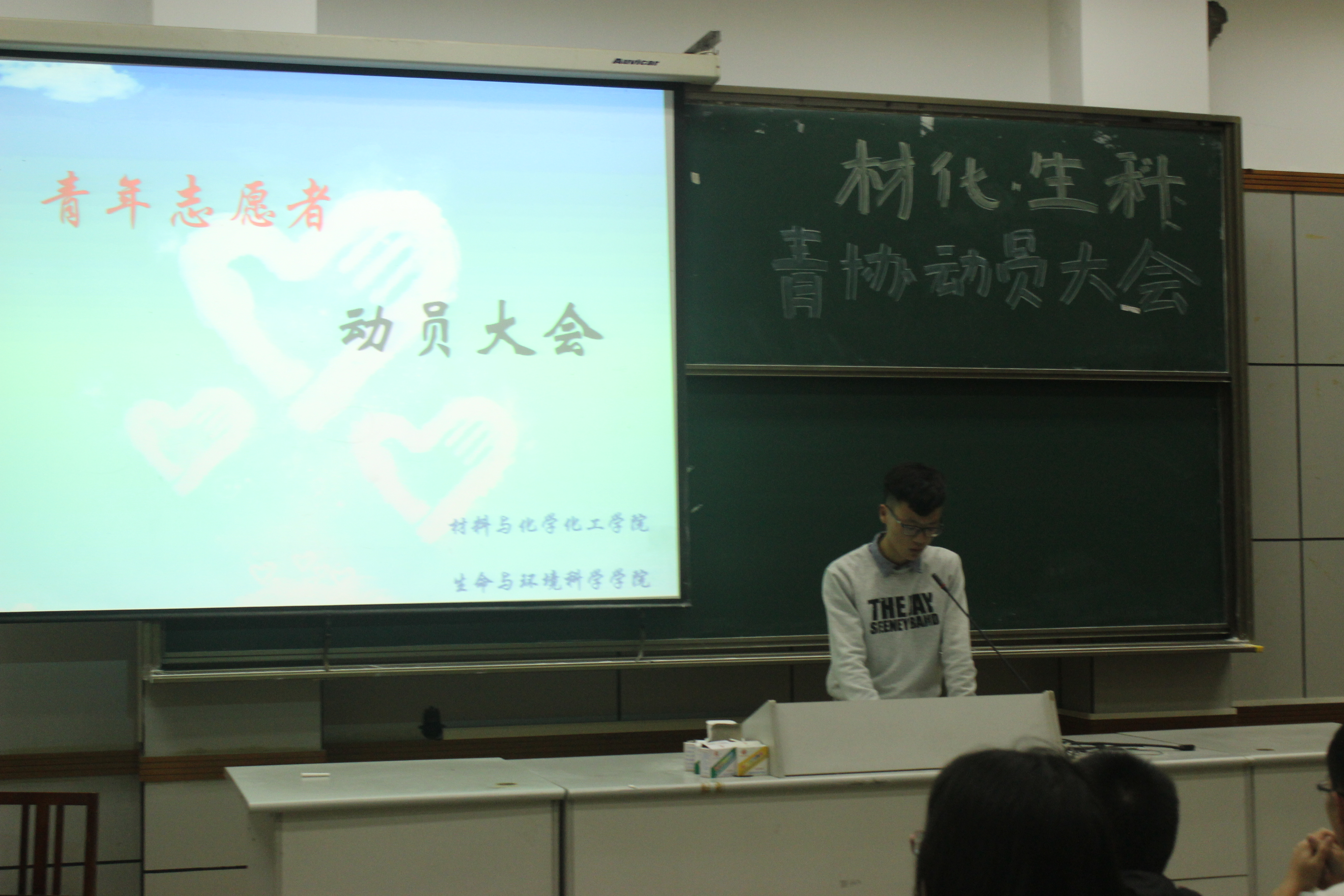 2017年10月27日晚七时,无码影片 及材料与化学化工学院联合主办了青年志愿者动员大会。此次大会旨在加深会员对青协的了解与认识,让更多志愿者共同投身青协志愿服务活动。出席此次活动有材料与化学化工学院社团联合会主席张可,无码影片 青年志愿者协会会长吕棋聪,材料与化学化工学院青年志愿者协会部长王睿。