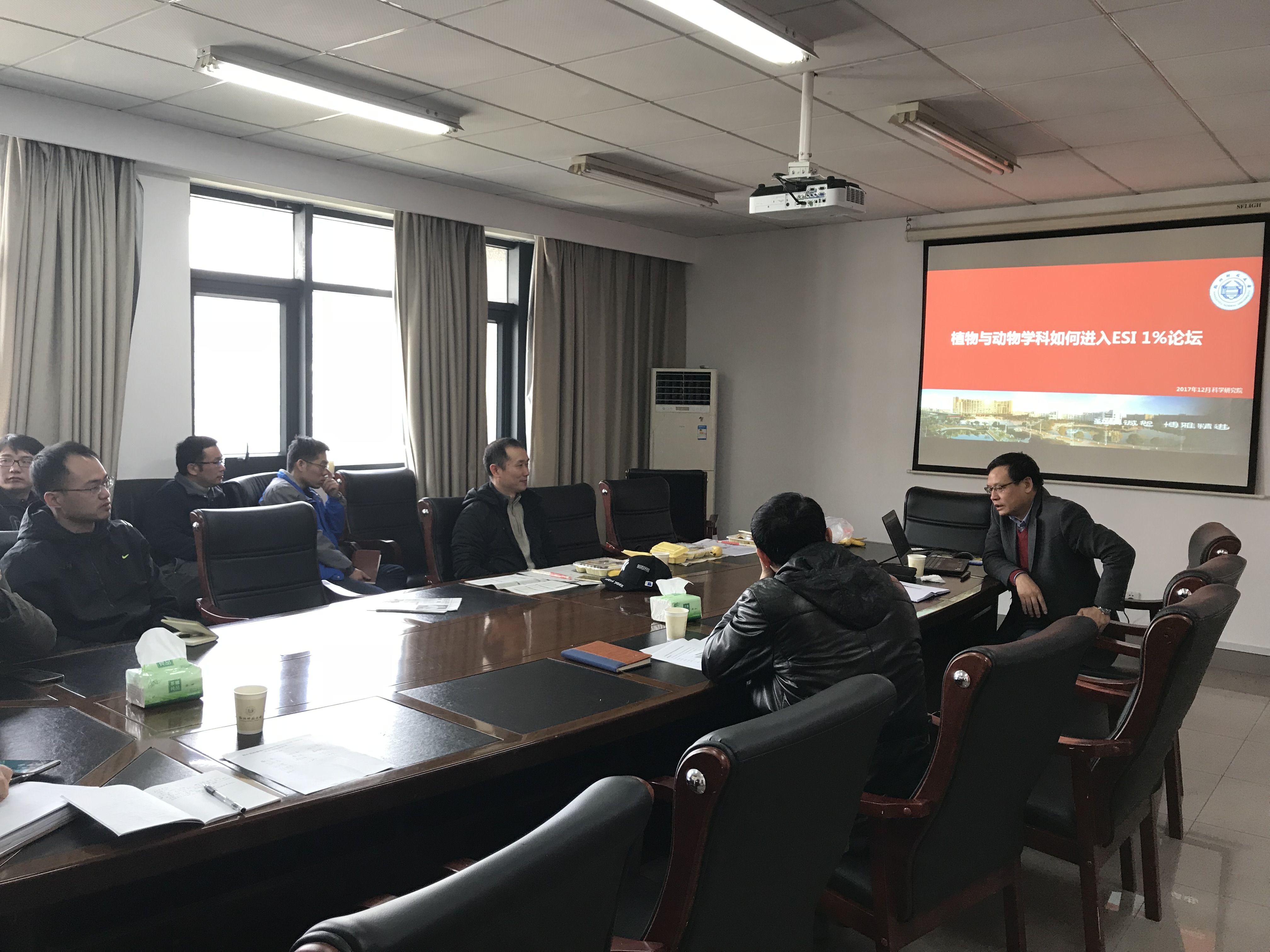 章鹏飞院长针对植物与动物学科如何进入ESI前1%做了报告,报告分为进入ESI全球前1%的浙江省高校排名情况,我校重点学科及潜力学科的表现情况,我校入选这一期的ESI数据库的高水平论文情况和ESI各学科期刊数量等四个部分。通过章院长的报告,使我们对目前的形势更为明确,对于今后的努力方向可以更好的有的放矢。