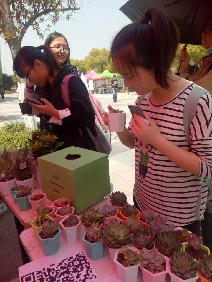 中午十一点,协会成员将活动所需的桌椅和奖品搬到二期广场,然后进行活动现场的布置。协会成员当场将新鲜的多肉植物一份一份包装好,变成了一盆盆精美的盆栽,这一举动吸引了一大批来往的同学,他们纷纷聚集在这里想要一探究竟。成员们详细地向他们讲解今天的活动。本次活动主要是通过微博扫描二维码或者关注绿植领养活动的公众号进行抽奖。现场的奖品琳琅满目,有惹人注目的生态瓶,有彩色大盆子的多肉,还有黑色小盒子的迷你多肉等等。当成员们将种植好的多肉整齐地摆在桌子上时,同学们已经迫不及待地想拿走这些小植物了。在协会成员的引导下,他们非常积极地参与活动,多肉被一拨又一拨的人捧在掌心领走,他们有感而发地在KT板上写下自己的祝福。下午13点左右,80多盆新鲜的绿植已经所剩无几,成员们收拾好桌椅,当所借去的物资被归还的同时,也宣告了这次绿植领养活动完美落幕。