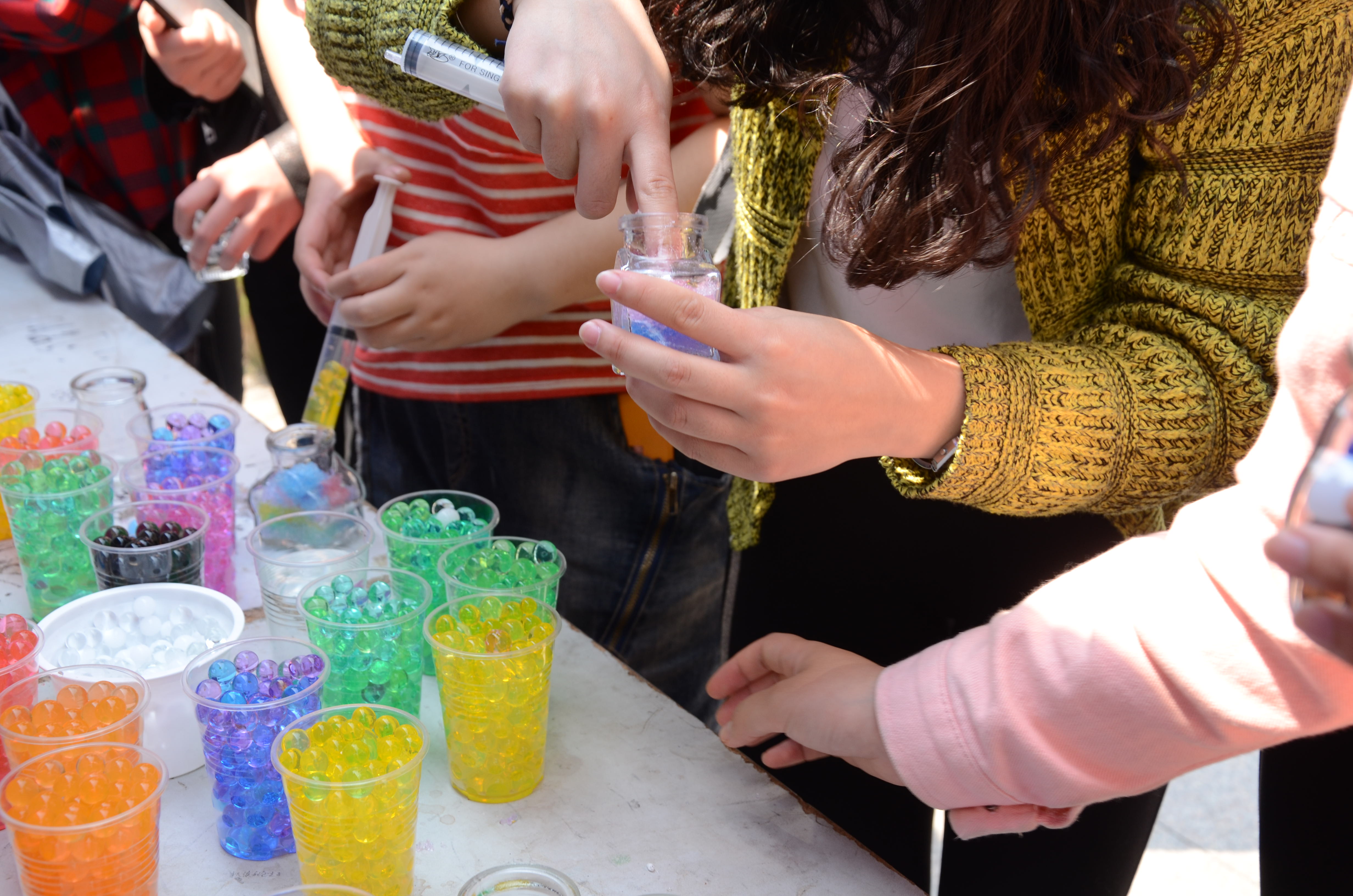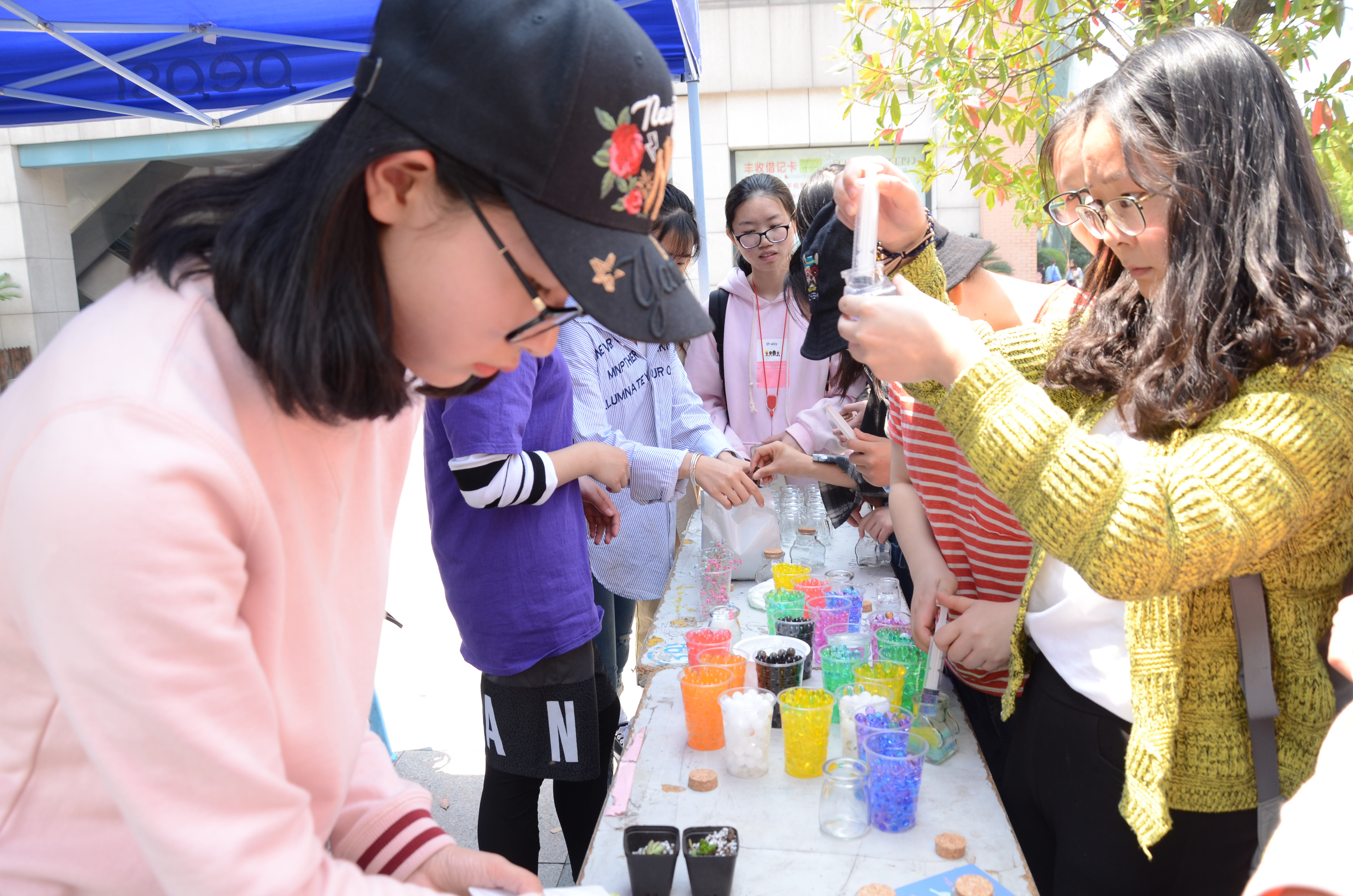 三社同心,可谓是创意十足,二期广场是人潮涌动,渐渐攀升的气温也阻挡不了杭师学子的热情,活动内容也是精彩纷呈,生物科技节的活动与自然和科学有着密切关系,因此他们开办了亲手制作雪花瓶和星空瓶的活动。只要往桌上准备好的小玻璃瓶中倒入一定的造雪粉,再往玻璃瓶中倒入一定的水,依靠聚合体对水的渗透性,一段时间以后就可以得到一瓶雪花,同学们还可以在雪花上面进行各种装饰。而星空瓶则是将海洋宝宝捣碎后一层层铺垫起来,远看就好像星空一样。同学们乐在其中,一个个属于自己的独一无二的瓶子慢慢诞生了,这样的瓶子,不再是一个简单的工艺品,它不仅体现出了同学们的动手能力、耐性与细心,也融入了同学们亲手制作的快乐。