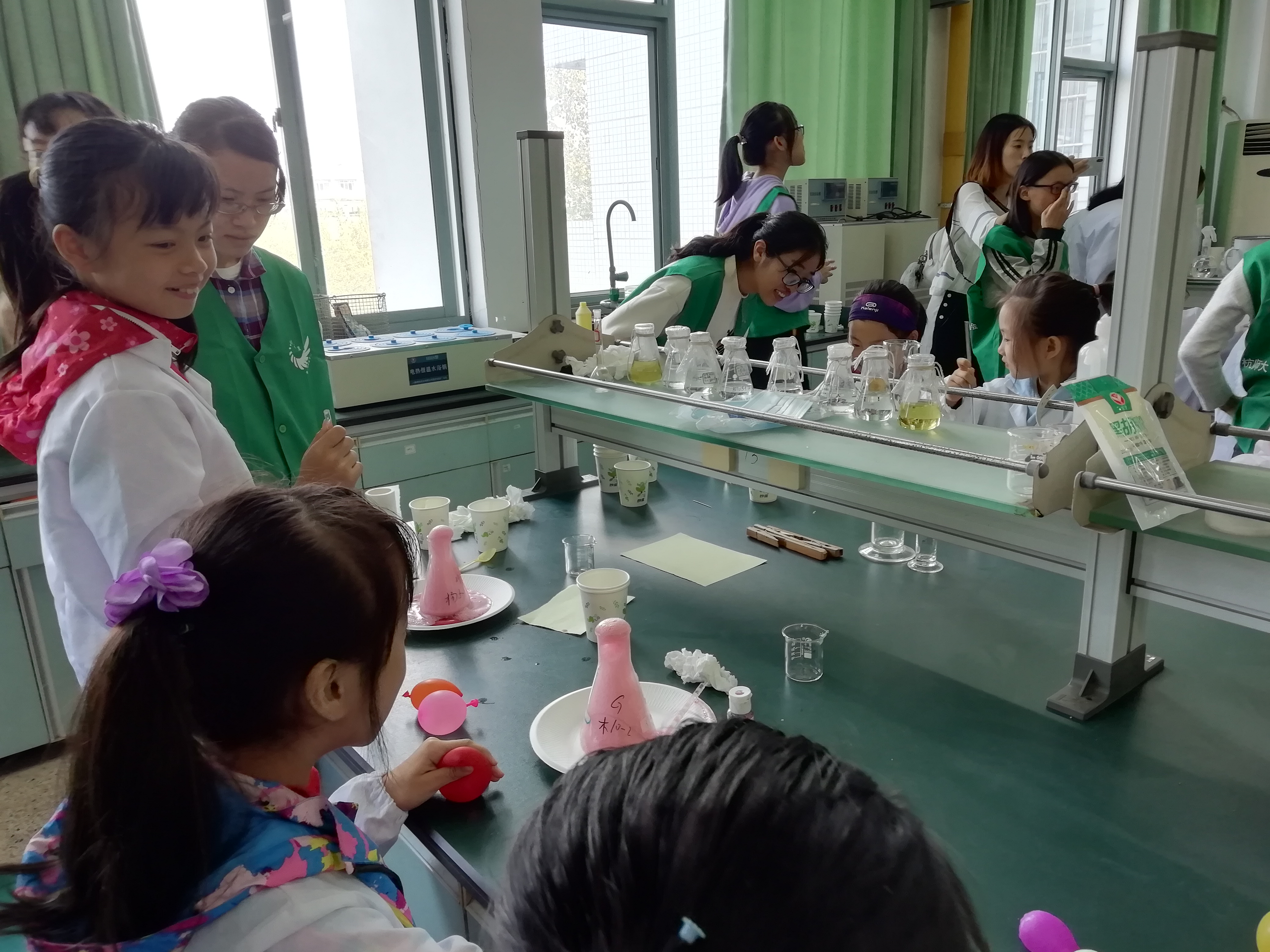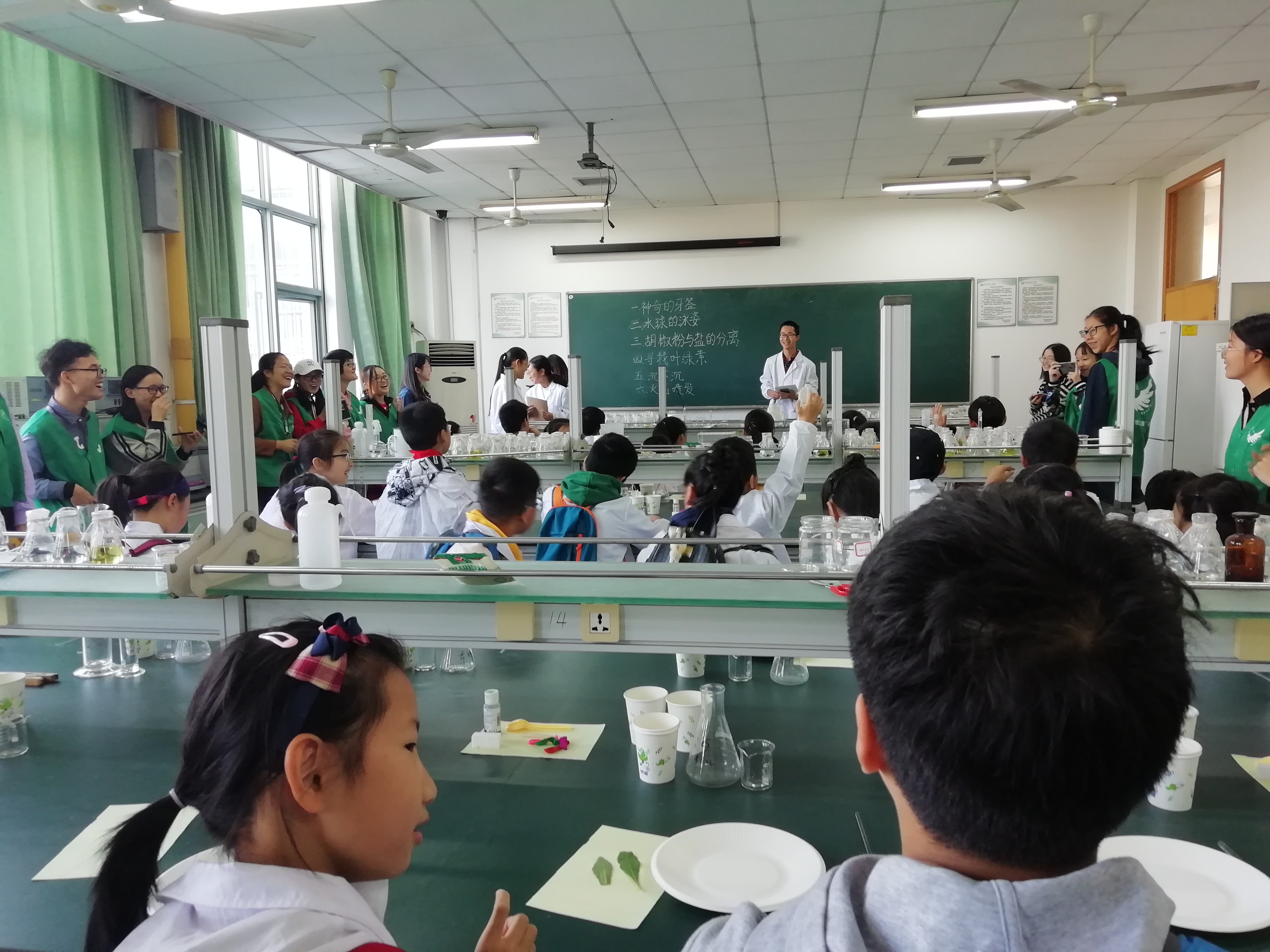 接下来的两个实验是“胡椒粉与盐巴的分离”以及“叶绿素的观察”,由第三位讲解员为小朋友们讲解。其中“胡椒粉与盐巴的分离”充分为小朋友们展示了静电的魅力,而“叶绿素的观察”则更为具体地带各位小朋友们进入了微观的世界,将抽象的叶绿素概念具体化。更为重要的是小朋友们通过这个实验了解到了花草树木存在于地球上的重要价值,领悟了环保的重要性。第四个实验“沉不沉”,其有趣的名字就引起了孩子们极大的兴趣,加之讲解员的详尽讲解,他们对于表面张力这一概念有了更深入的了解。最后一个实验“火山喷发”,孩子们七彩的实验成果十分赏心悦目,让一旁细心工作的志愿者们为之鼓掌。