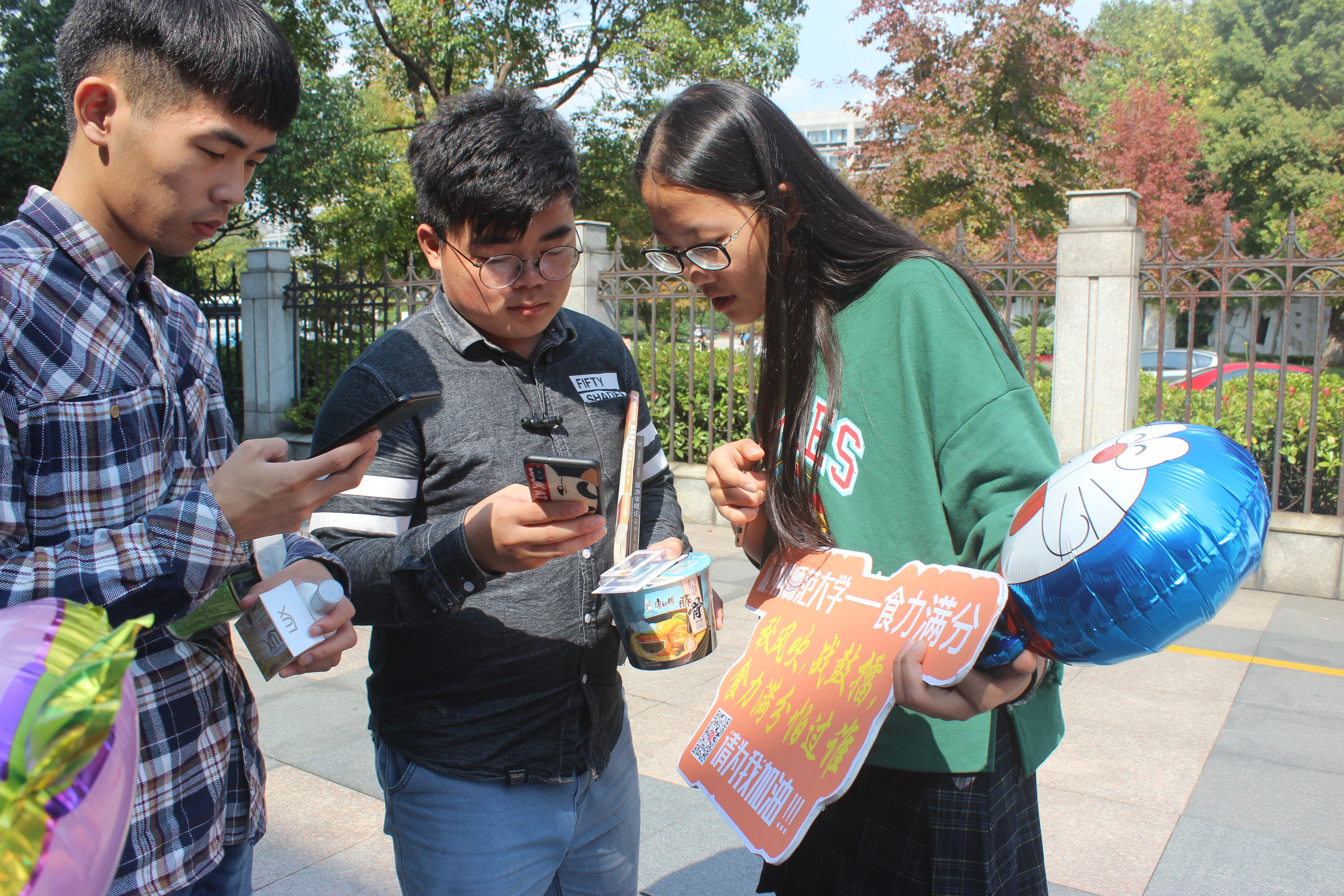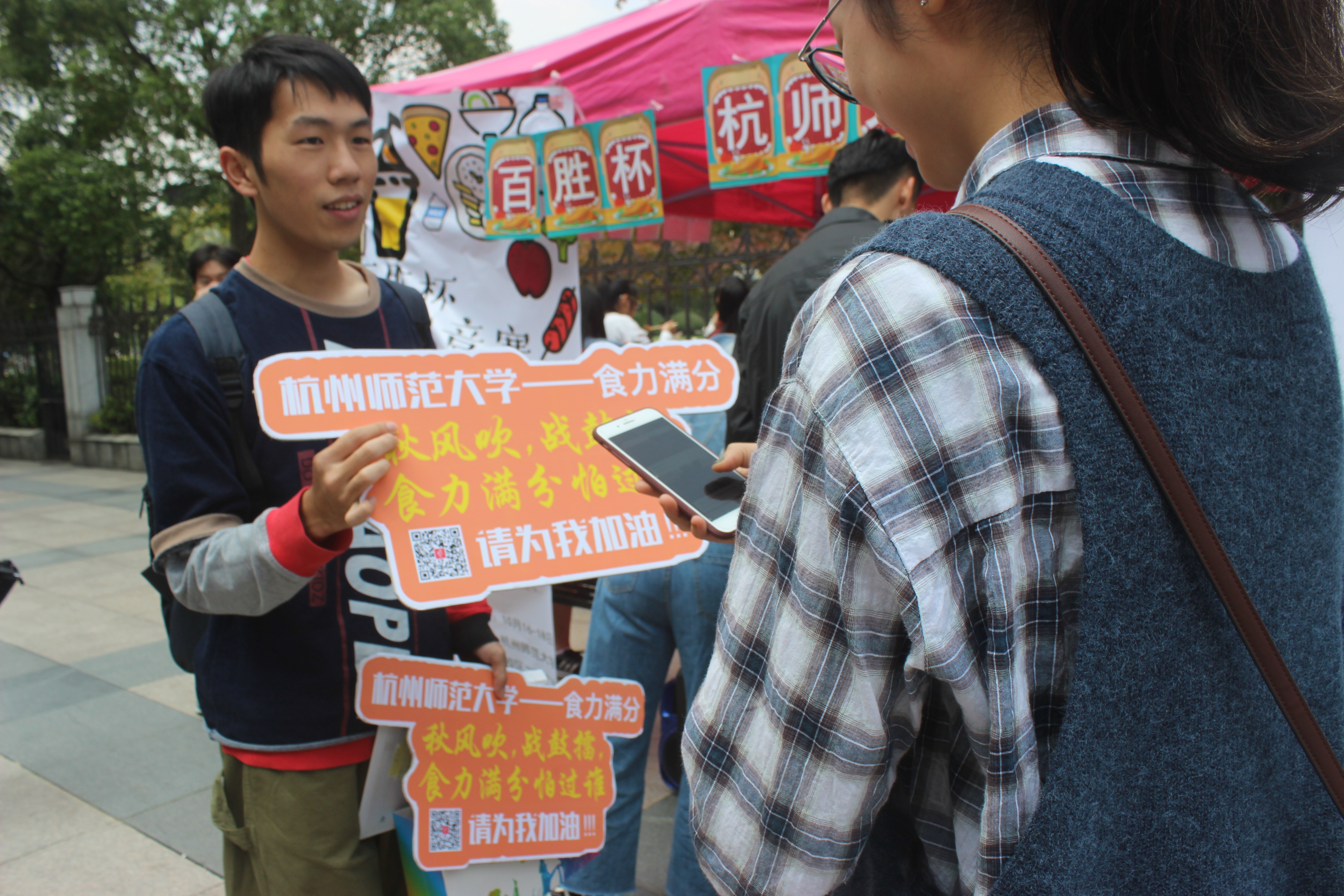 中午,二期广场上人来人往,经过的同学总是会向活动帐篷处看上几眼,学术科技部的成员们都热情地与来往者交流。活动现场播放着动感十足的音乐,还有同学在现场演唱《白羊》,着实是吸引了许多人的眼球。在同学们驻足聆听的同时,介绍者们趁机上前讲解“百胜杯”并希望大家多多支持。听到是为我校参赛队伍支持助力,同学们便纷纷拿出自己的手机扫描二维码并询问步骤,介绍者也十分细心地一步步进行说明。进行了投票后,同学们不仅可以和可爱的“熊本熊”玩偶互动拍照,还可以获得手机支架、小本子、LED灯、暖宝宝及卡通气球等精美礼物。
