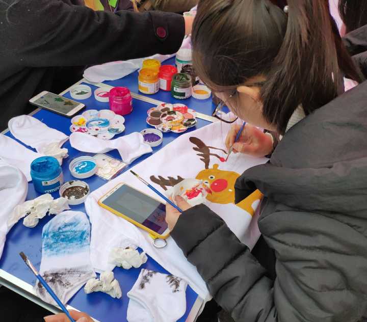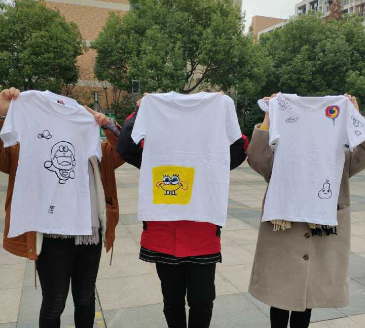 活动开始一个小时,30件衬衫,30双袜子所剩无几,但来往的人没有减少,而是越来越多。来来往往的人群可以看出同学们对这特别且富有情感的工艺活充满好奇与惊喜!相信各具特色的文化衫会给校园生活带来更多活力,也会给自己的生活带来一些启示。