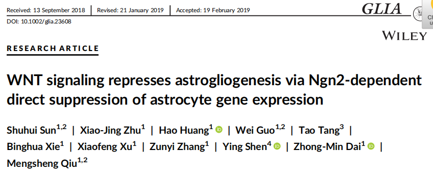 2019年3月19日,无码影片 邱猛生团队在 Glia (影响因子:5.846)期刊在线发表题为“WNT signaling represses astrogliogenesis via Ngn2-dependent direct suppression of astrocyte gene expression”的研究论文,揭示了WNT/β-catenin 信号通路通过转录因子Ngn2抑制星形胶质细胞发育的调控作用。