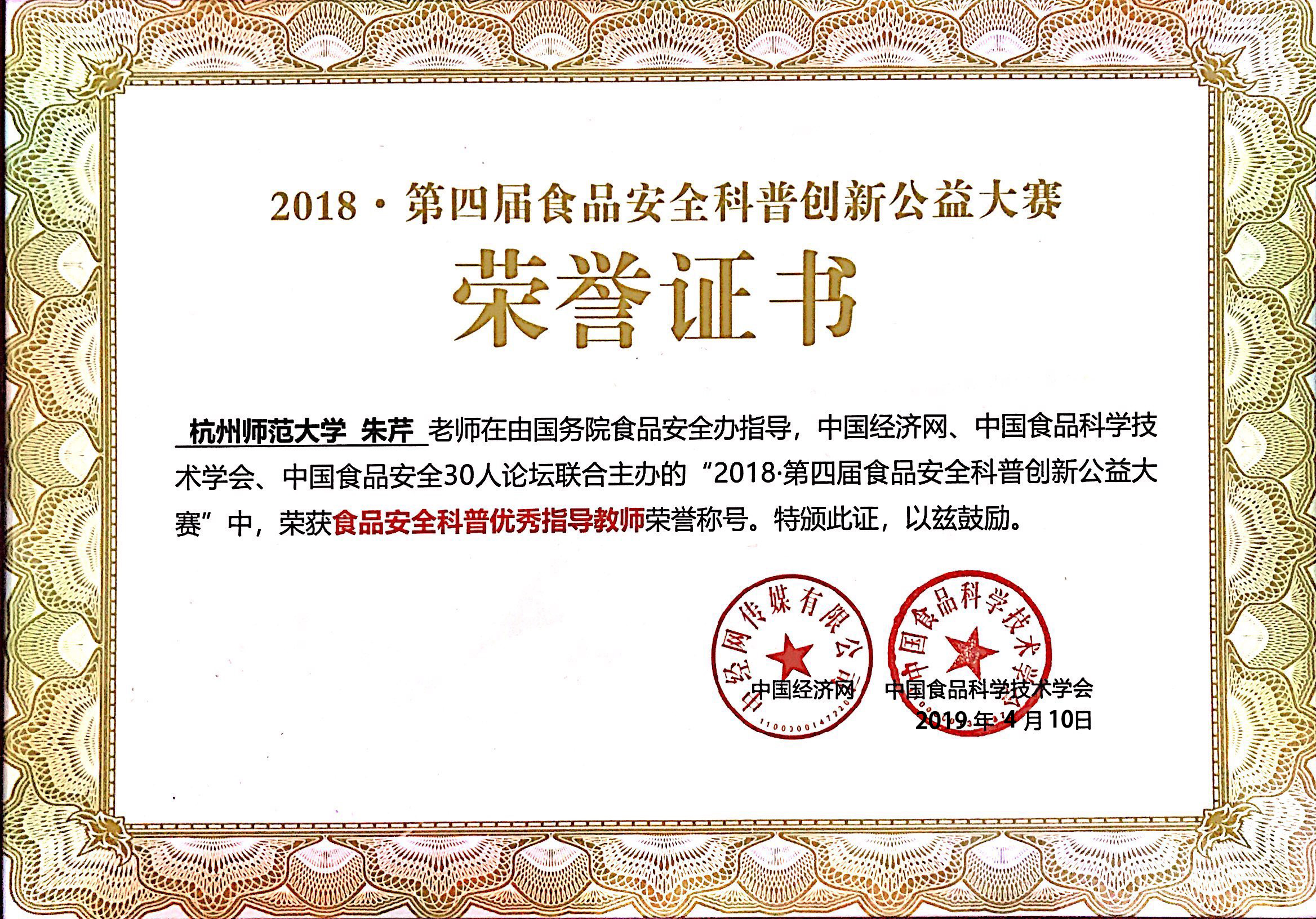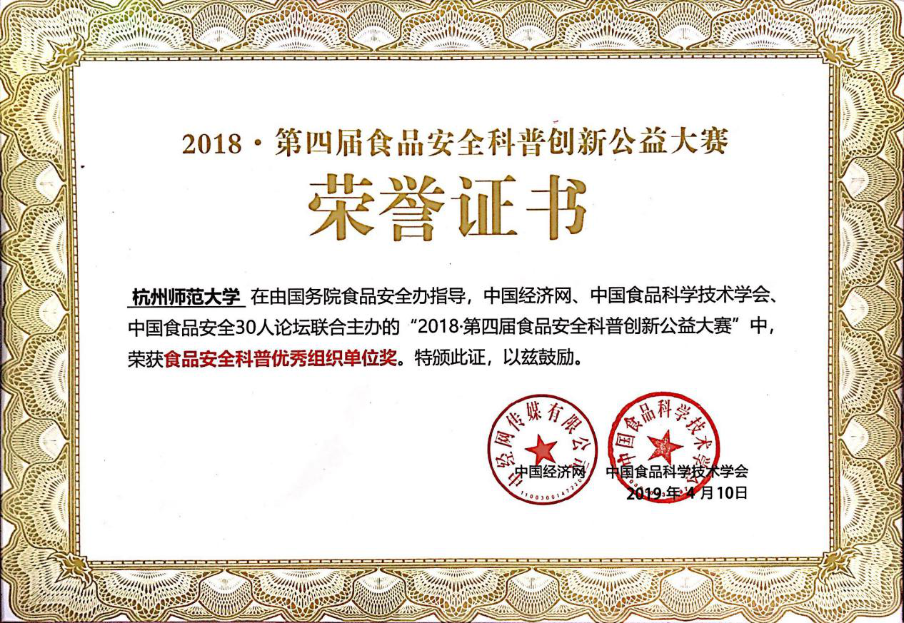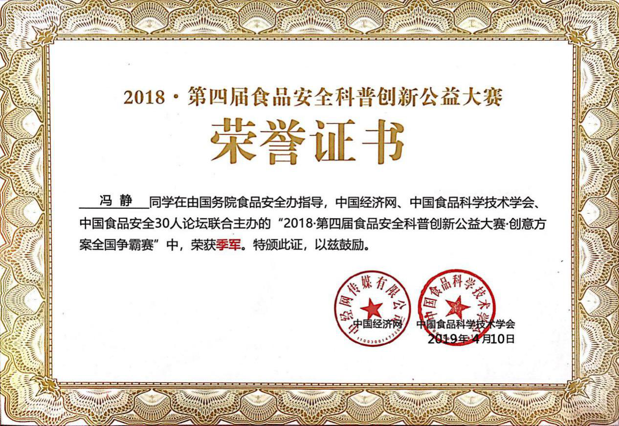 2019年4月10日,第四届食品安全科普创新公益大赛暨高校总动员总结表彰大会在北京经济日报社召开。本届大赛由国务院食品安全办指导,中国经济网、中国食品科学技术学会、中国食品安全30人论坛联合主办,无码影片 承办,康师傅控股有限公司独家支持。我院“求真务食”社团食安171班冯静同学在此次创意方案全国争霸赛中喜获季军。总结大会为无码影片 颁发了年度“食品安全科普优秀组织单位”称号,并为对大赛贡献突出的指导教师朱芹老师颁发了“食品安全科普优秀指导老师”荣誉证书。