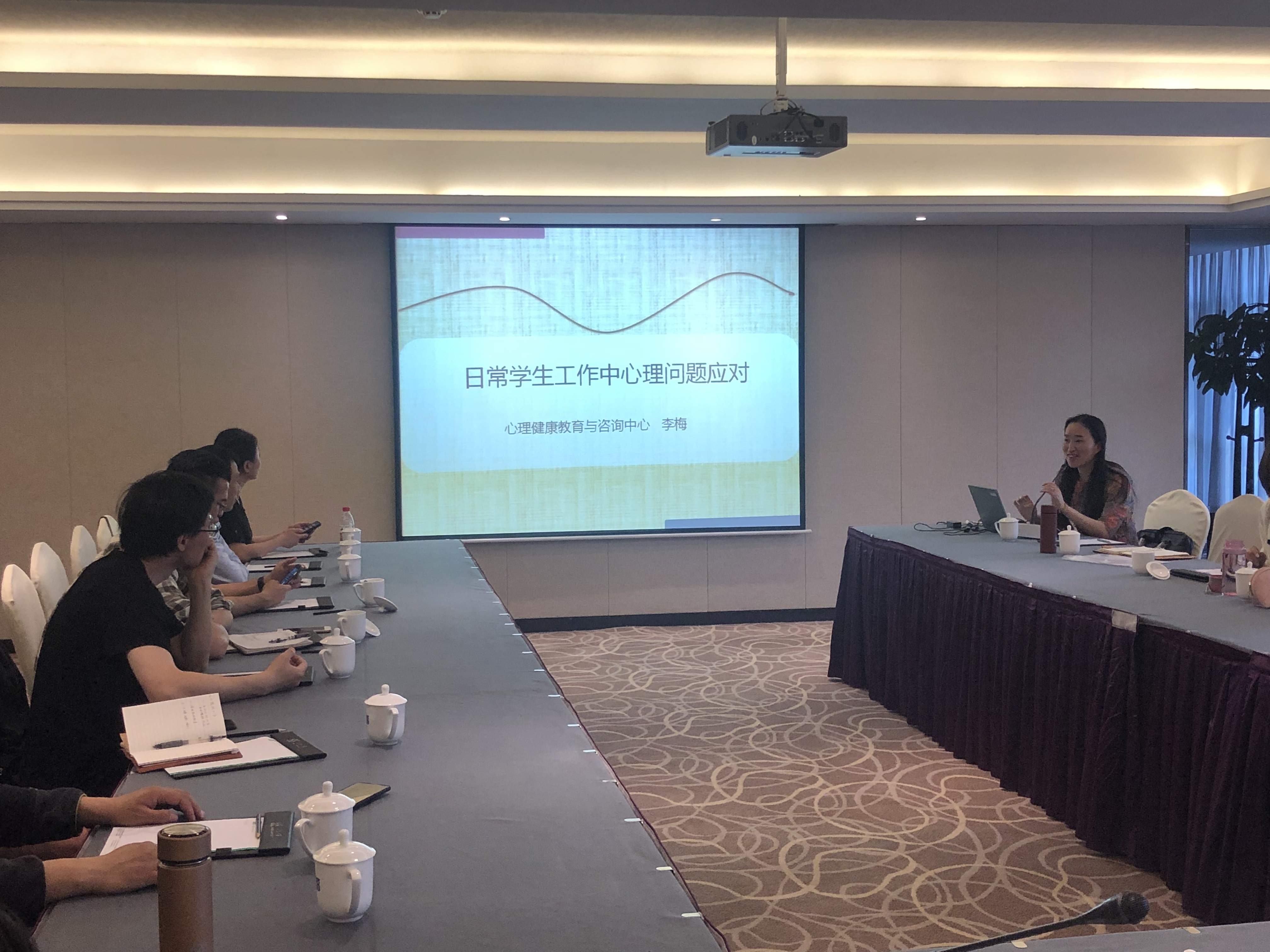 首先由校心理咨询中心主任李梅老师以日常学生工作中心理问题应对为题,向在座人员开展培训。李老师以当代大学生的心理特点为切入点,结合我院学生整体心理状况实际,从精神疾病、人格障碍、重度抑郁症3类大学生常见心理问题的表现,分析如何发现特殊学生,以及怎样解决重点关注学生的突发事件。
