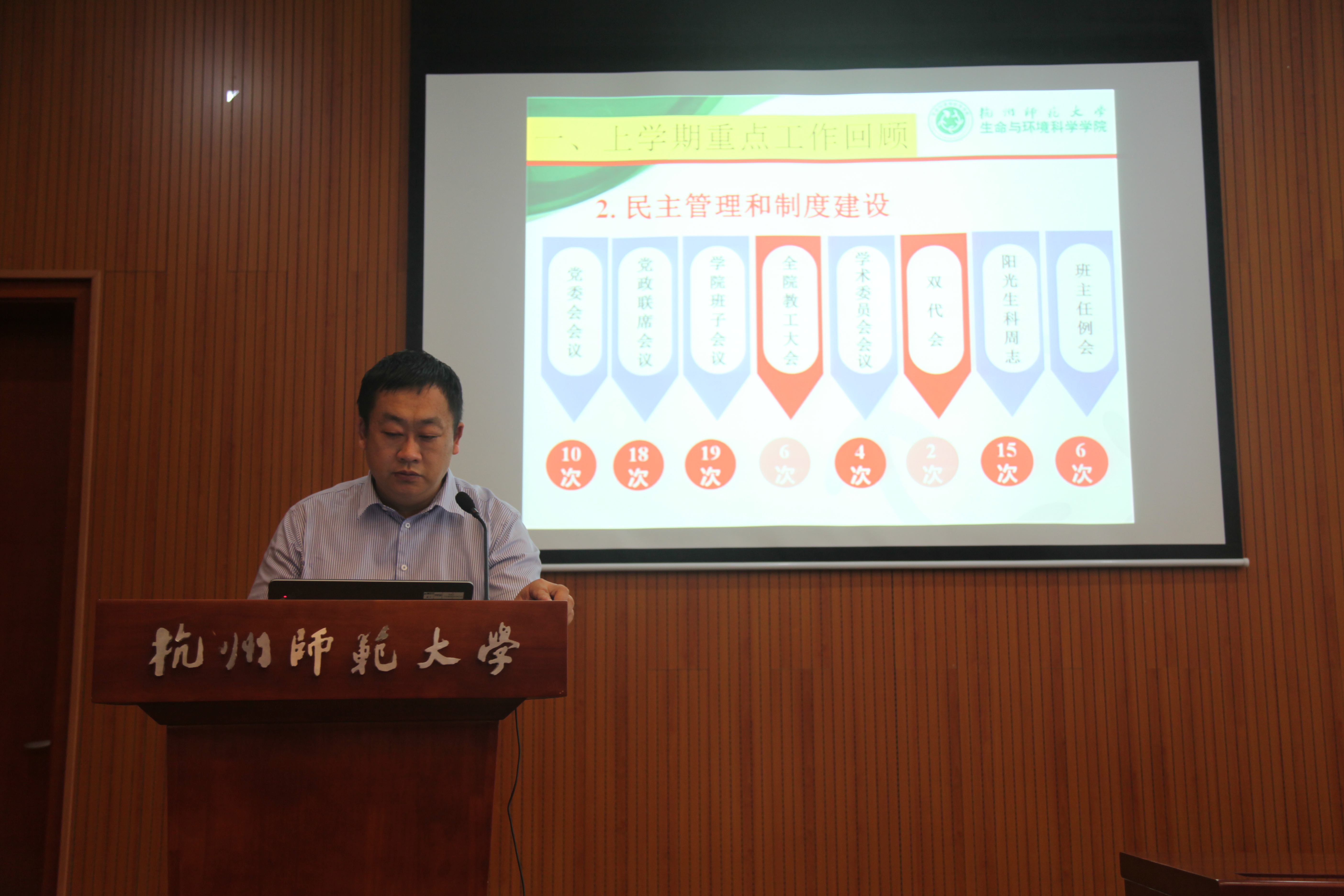 8月30日上午,我院在仓前学术交流中心A-118室召开全院新学期教职工大会。学院全体党政班子成员,全体教职工参加会议。会议由党委副书记余洁主持。 执行院长张杭君代表学院党政班子做了新学期党政工作报告,详细介绍了学院上学期在党建、人才队伍、教学和专业建设,科学研究、学科与学位点、社会服务、教研平台和资产管理、财务、仓前搬迁、国际交流、学生管理、工会活动等各方面工作取得的成绩。张院长在肯定取得成绩的同时也提出了不足,并着重介绍了新学期学院各项重点工作和常规工作。