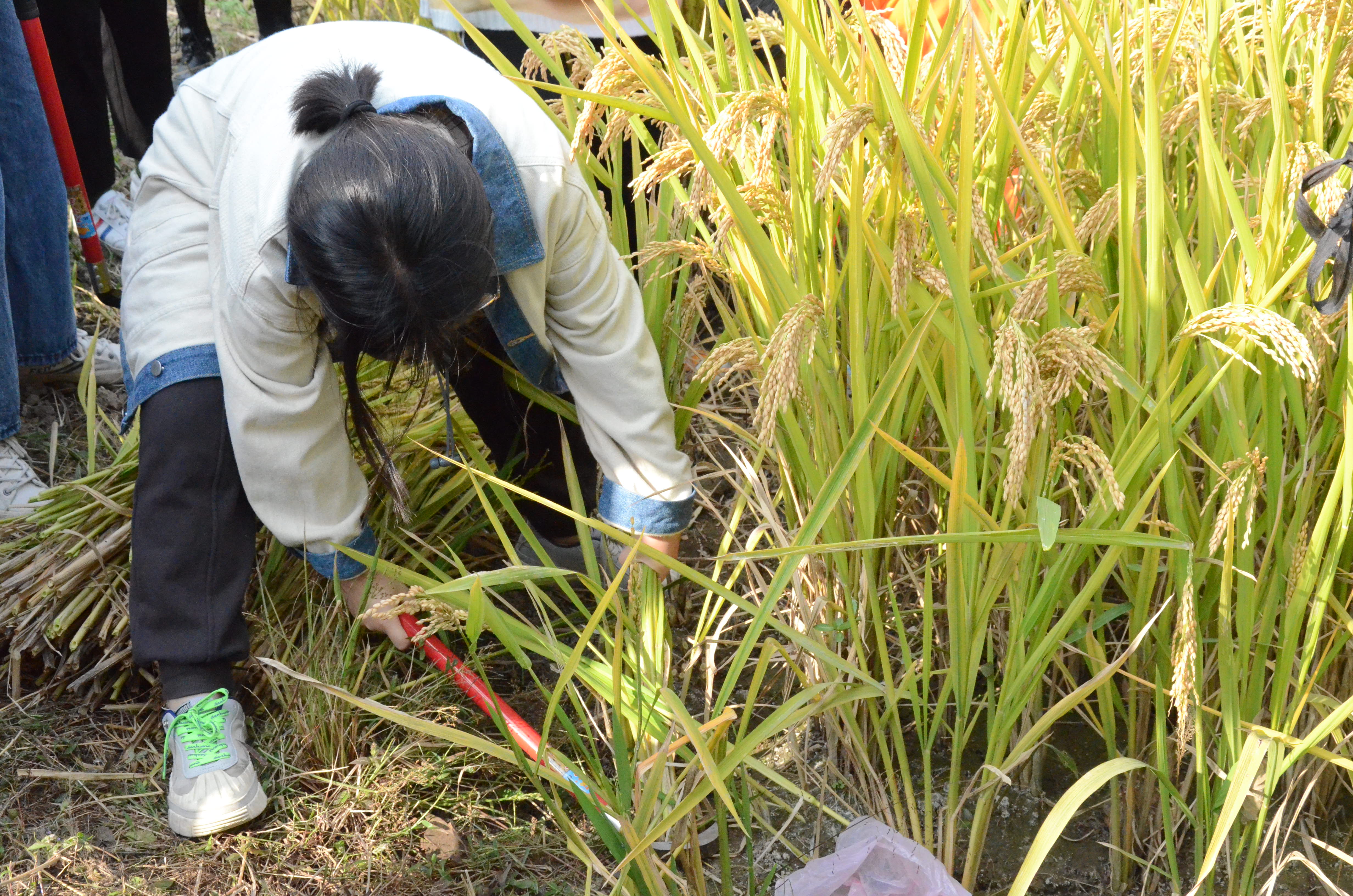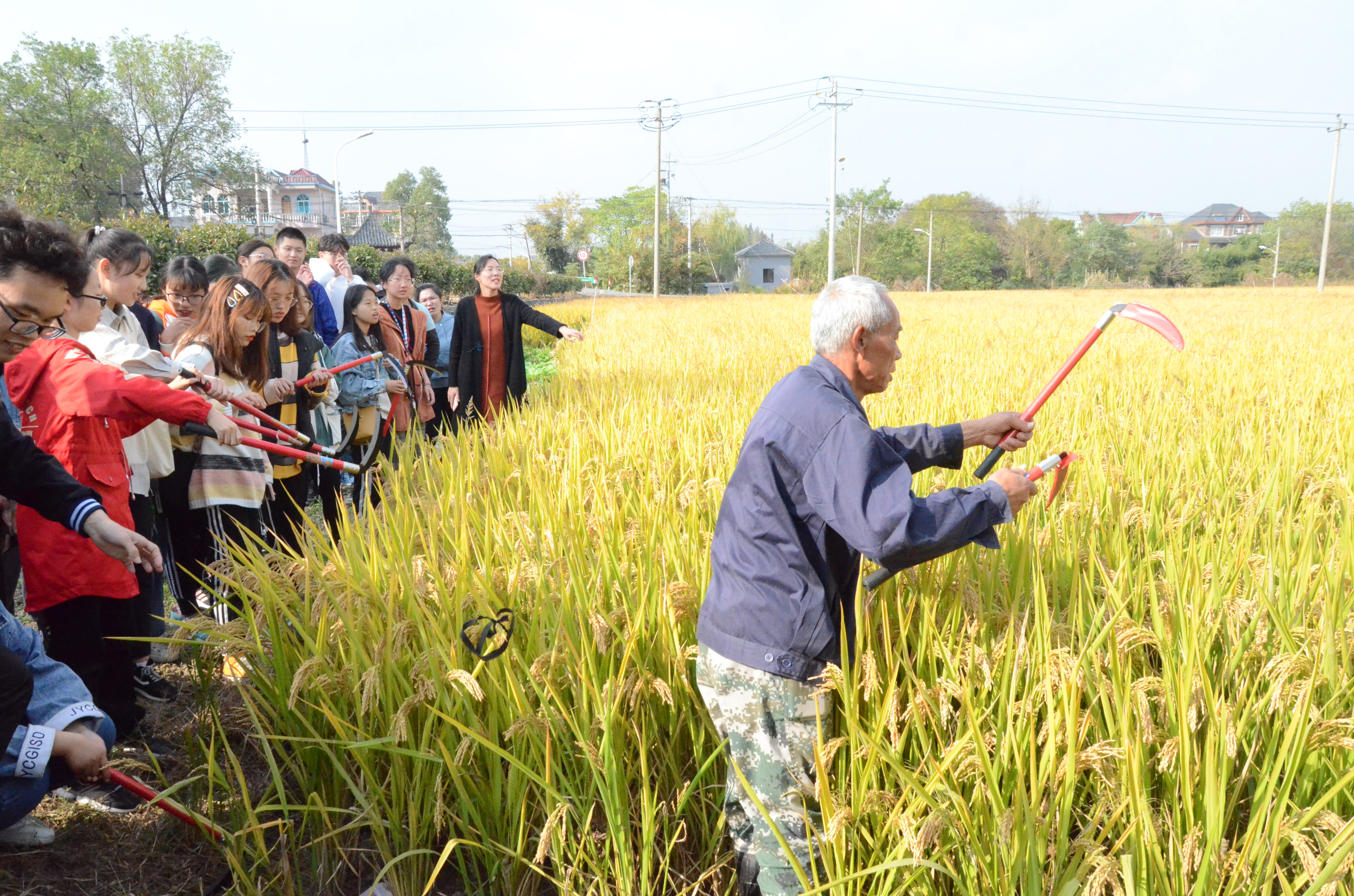 随后,轮到同学们亲自体验的环节。同学们自觉地分成几组,有序地轮流使用镰刀。虽然是初次体验,同学们缺乏必要的经验,但在农民大伯的指导下同学们快速高效地割完了指定地区的水稻,收获颇丰,大家纷纷合影以纪念本次有重要意义的活动。