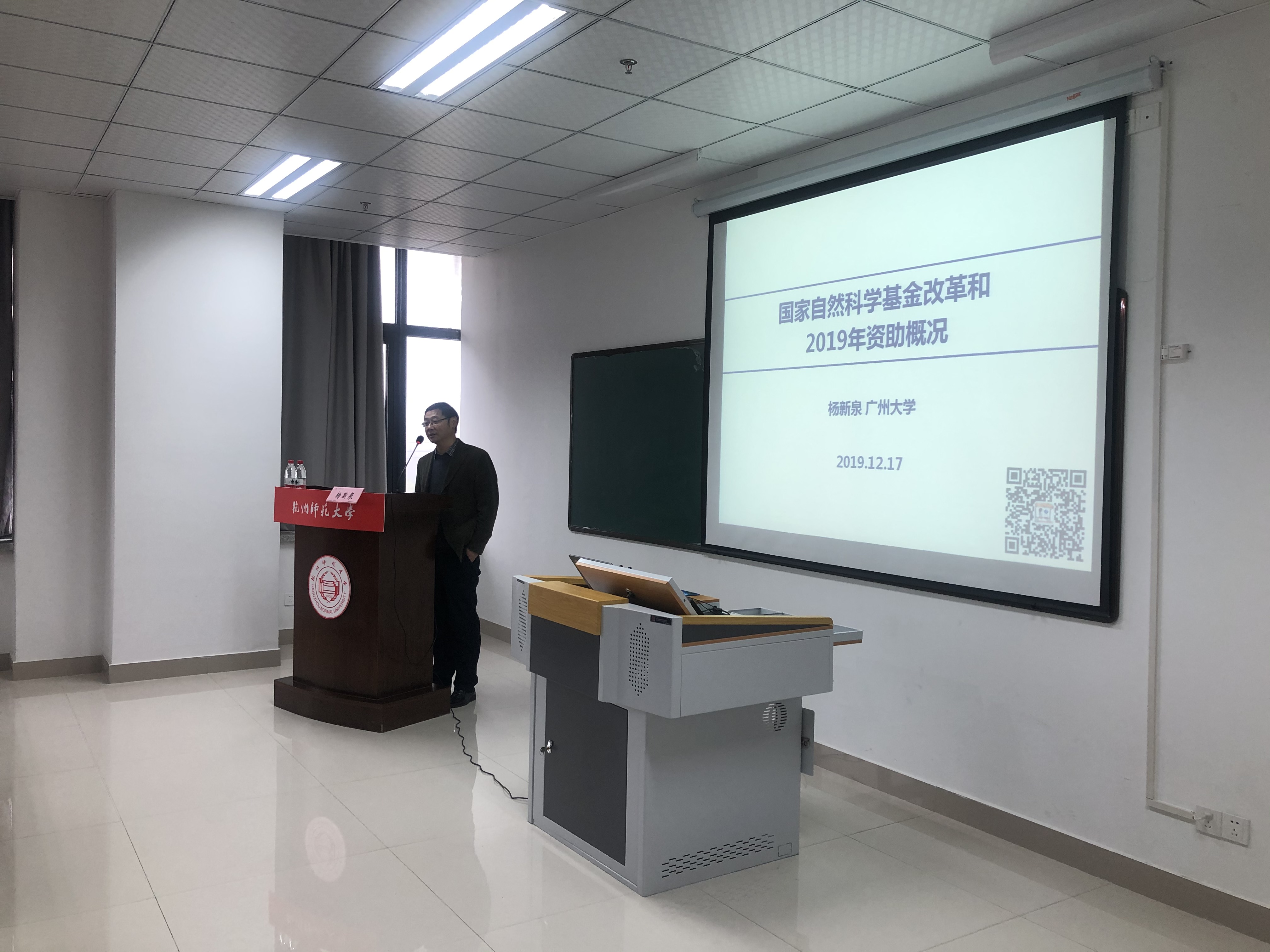 会上,杨新泉回顾了国家自然科学基金委员会的发展历程,介绍了国家自然科学基金项目评审变化及改革举措;通报了2019年自然科学基金项目资助概况,指出了2020年项目申请注意事项,并特别强调了在申请中进一步突出科学问题的重要性。随后,杨新泉和参加报告会的教师进行了热烈、充分和广泛的交流。杨新泉对于大家在个人基金项目申报过程中遇到的问题和困惑一一作了细致的解答。