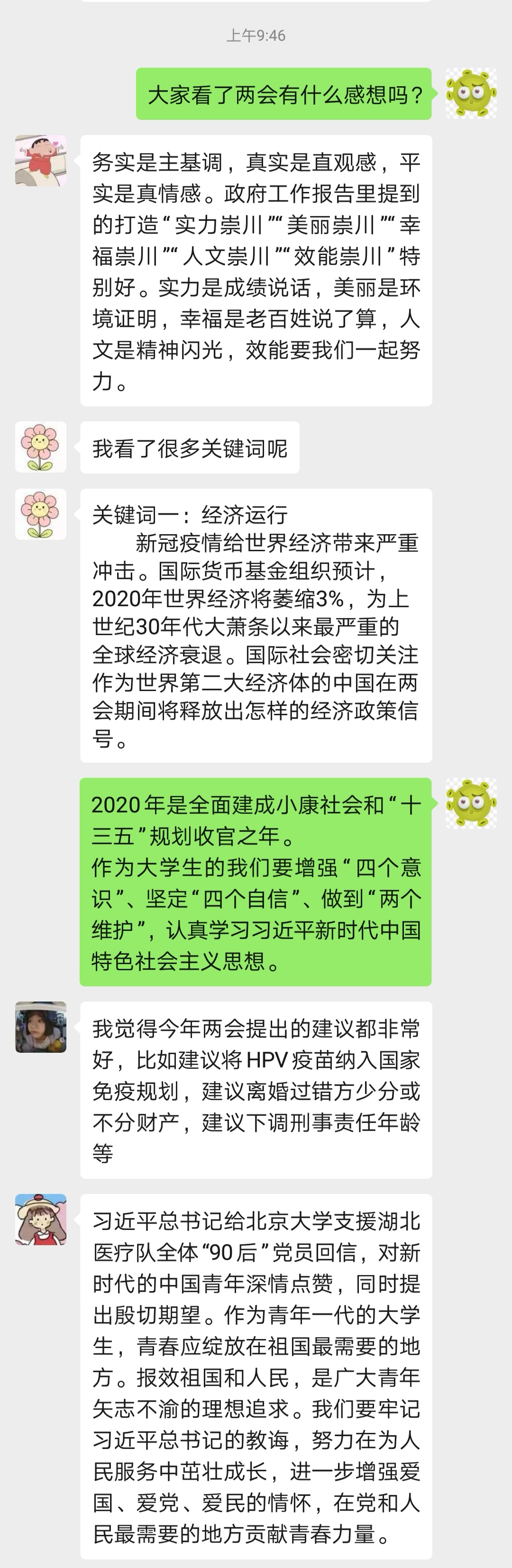 另外,无码影片 各年级各班级在线上开展了形式多样的“两会”学习活动。有些班级通过直播的形式一同观看“两会”直播,生科181班则以寝室为单位,开展了线上讨论会,对“两会”发表了自己独特的见解。同学们就习近平总书记对北大支援湖北医疗队的回信中有感而发,“作为青年一代的大学生,青春应绽放在祖国最需要的地方,报效祖国和人民,是广大青年矢志不渝的理想追求”。