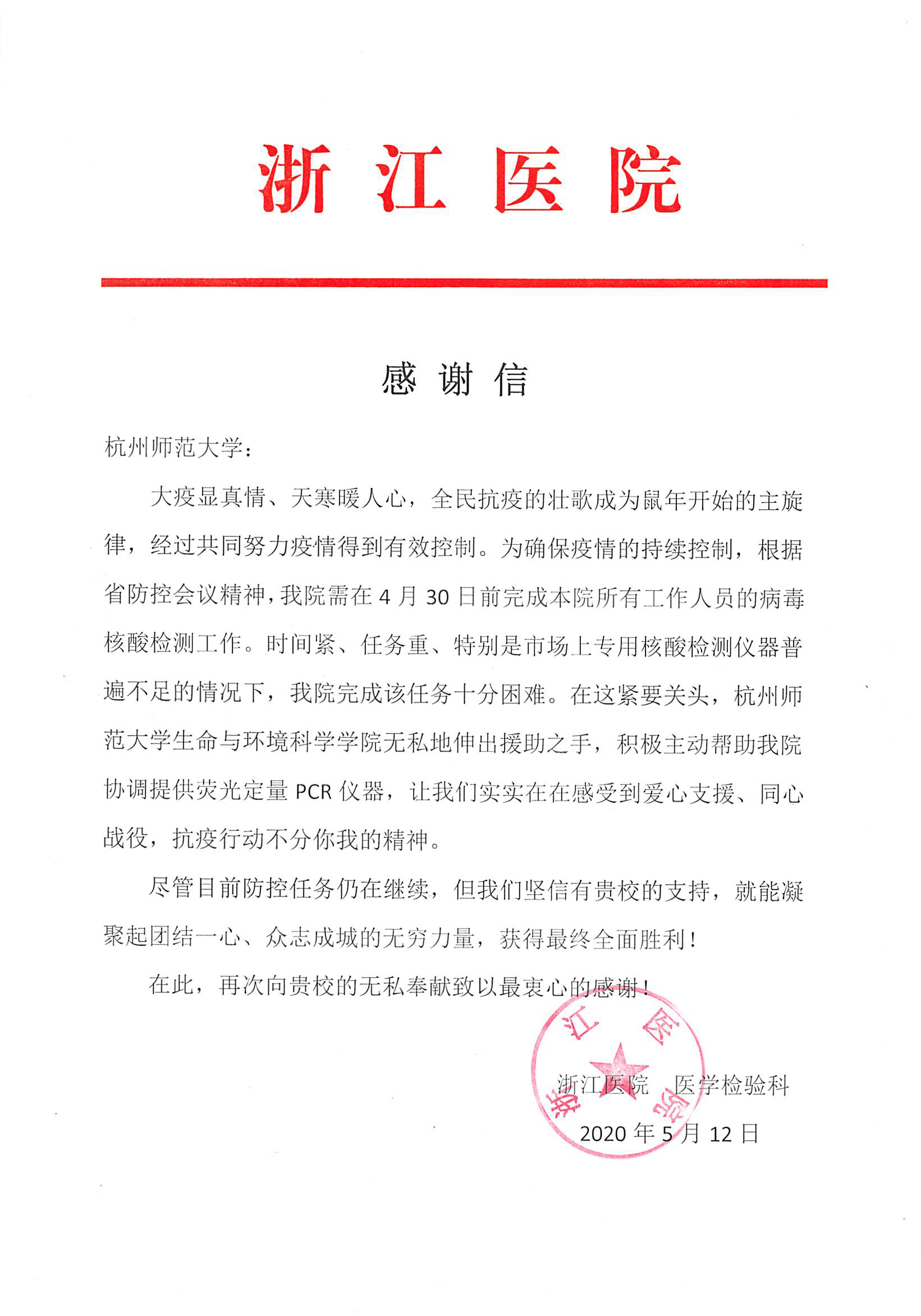 大疫面前见真情 爱心善举暖心田。浙江医院在面临专业检测仪器不足的情况下需在规定时间内完成院内所有工作人员的病毒核酸检测工作,在这紧要关头,我院无私伸出援助之手,积极主动为浙江医院提供荧光定量PCR仪器,并在学院李艳老师的使用仪器指导下让浙江医院顺利完成检测工作。事后,浙江医院特意写了感谢信来表达对我校我院爱心支援的衷心感谢。
