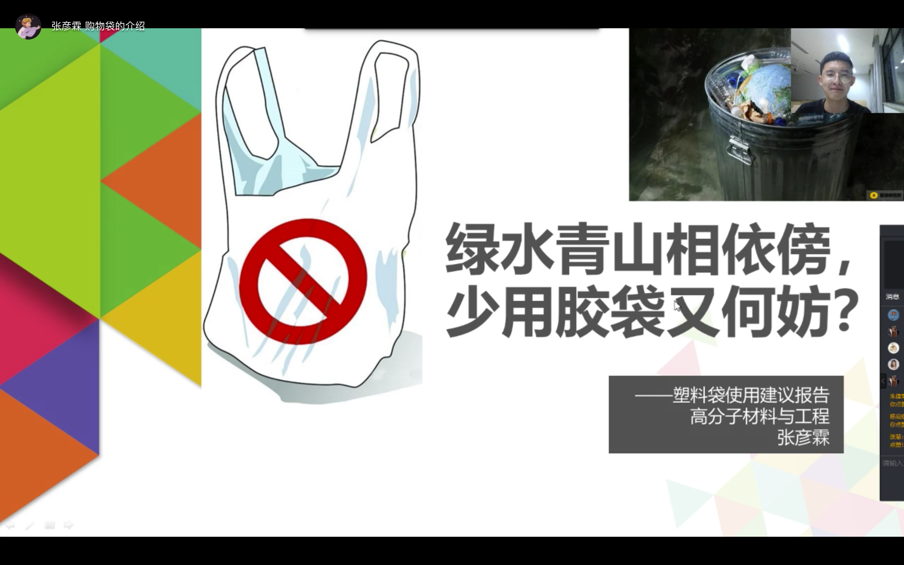 最后,组织人员还邀请了材料与化学化工学院高分子化学专业的张彦霖学长,学长本次演讲的主题是“绿水青山相依傍,少用胶袋又何妨?”学长就高分子材料中塑料袋的垃圾分类进行了更为深入、细致、专业的讲解,共分为四个部分:限塑令解读、可降解塑料介绍、三大购物袋对比、具体环保建议。当拒绝塑料袋成为一种习惯,绿水青山也就离我们不远了。整场活动同学们都积极踊跃地回答问题,和主持人有很好的互动。
