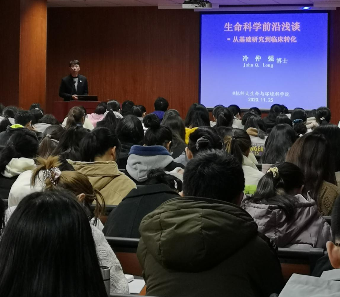 11月25日,来自美国耶鲁大学医学院首席研究员,现任国际企业协会(纽约)副理事长、医学研究中心教授、主任,国际企业协会中国区分会理事长,杭州哈鲁生物科技股份有限公司董事长冷仲强,应邀来我院为2020级本科生做主题为“从基础研究到临床应用”的讲座。冷仲强博士从曾在耶鲁大学医学院参与的细胞与分子生理领域研究的经验出发,介绍了生命科学的国内外发展现况及未来发展趋势。并结合自身在该领域丰富的科研经历,详细讲述了从基础研究到临床应用的过程,拓展了学生的视野及进一步提升了学生对生命科学领域学习的积极性。冷仲强博士以自身经历还多次勉励同学们要努力拼搏抓住机遇。学生们学习兴趣浓厚,并与冷仲強博士就生物专业就业方向、多学科交叉优势、干细胞治疗等话题作了深入讨论。