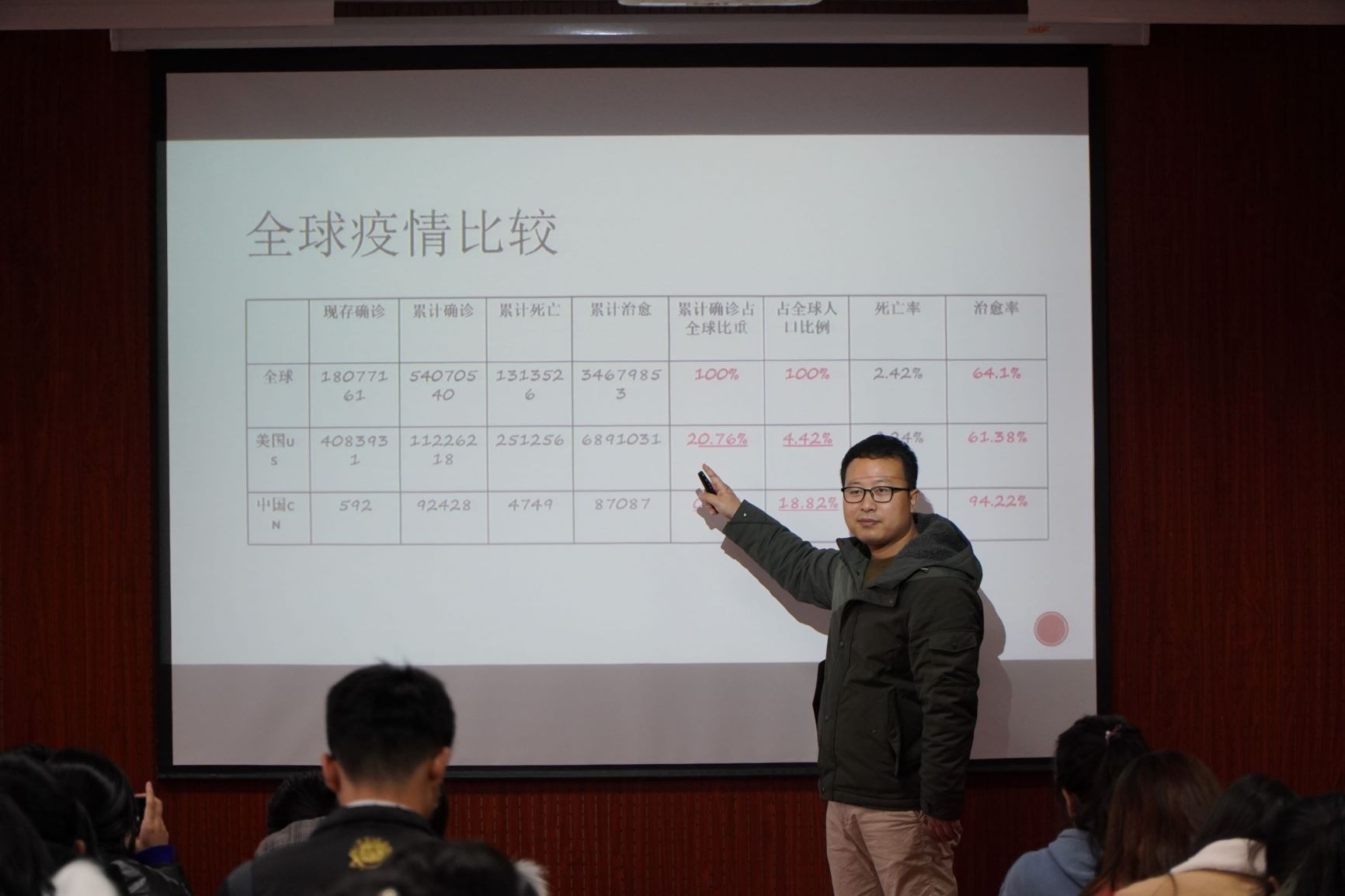首先,陈永杰老师从抗击疫情的角度出发,通过对比我国与其他各个大国在疫情期间如何加强和完善社会治理的数据和措施,以十分诙谐的语言将我国“以人民为中心”的优势进行阐述。随后,陈老师就这一优势是如何在我国政治、经济、文化和社会四个方面中的体现进行了解释,说明中国共产党“以人民为中心”的优势。