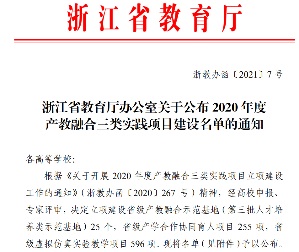 根据《浙江省教育厅办公室关于公布 2020 年度产教融合三类实践项目建设名单的通知》(浙教办函〔2021〕7 号),我院倪伟敏老师主持的“河流和湖泊水质监测虚拟仿真实验”获省级虚拟仿真实验教学项目。