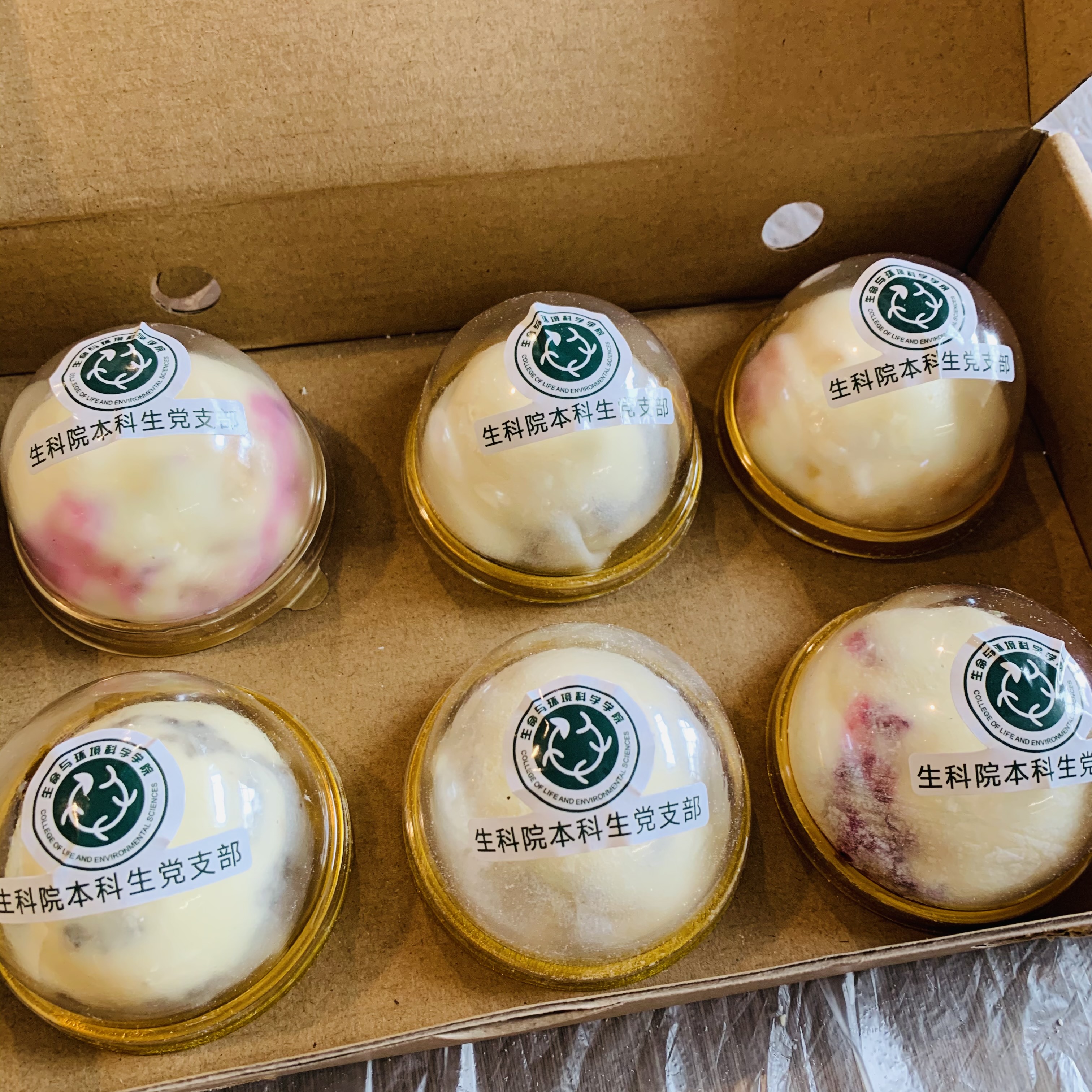 2021年4月28日上午七点半,大家便着手开始进行材料的准备工作。每位学生党员有序而又忙碌地制作着,融化黄油、打发奶油、加热棉花糖……经过一上午的辛勤努力,一批雪花酥和数十个雪梅娘就此出炉。制作过程中也出现了许多问题,但经过不断地尝试与改进也都成功解决了。不少同学表示,这是他们第一次尝试制作甜品,是一次很有趣而又有意义的体验,在制作过程中也学到了许多食品安全的相关知识。制作完甜品后,学生党员们将其精心包装好,并贴上了我们院的专属logo,之后将其送给了各位老师、后勤人员与保安。