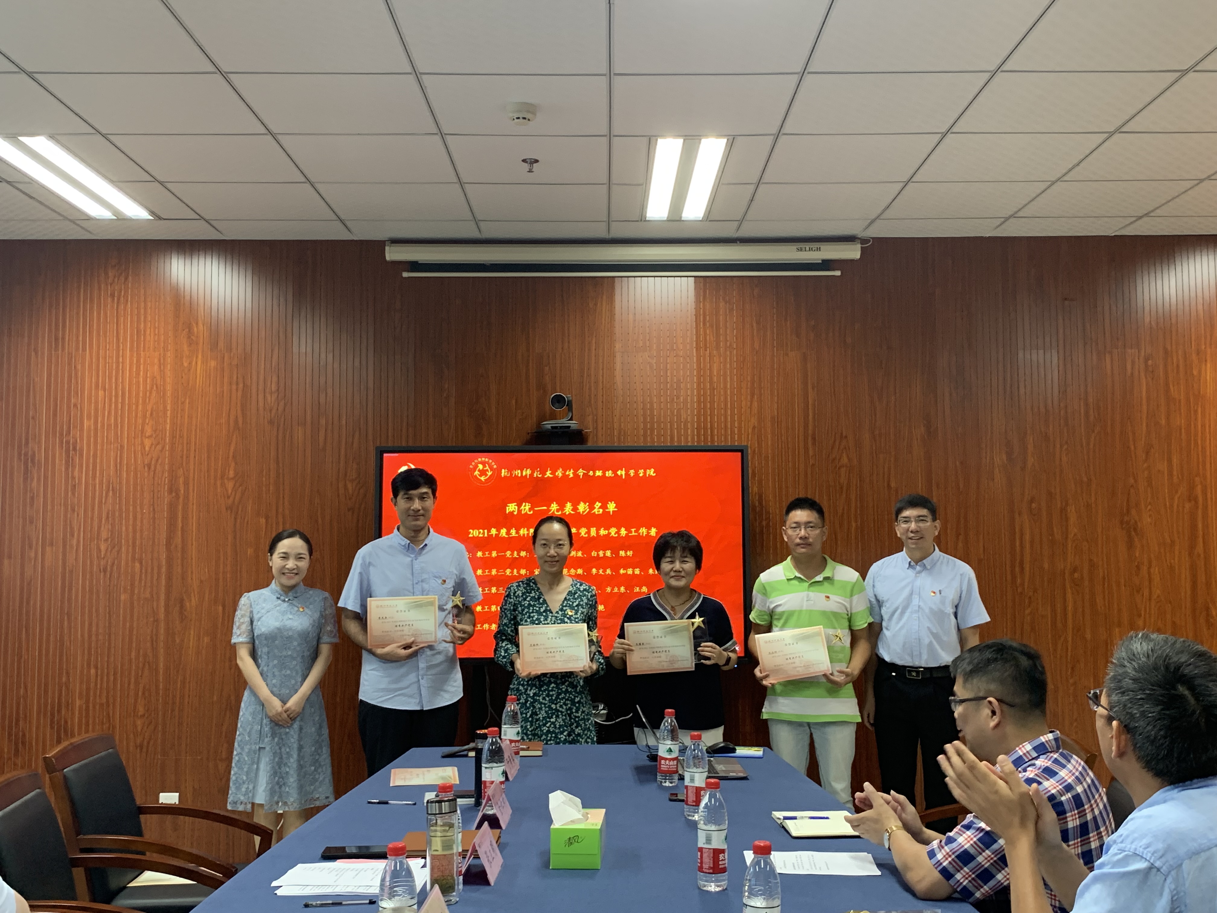 张立明宣读了2021年学校和学院“两优一先”获奖名单,学院领导对获奖人员进行颁奖和合影。随后进行了新入党学生代表向老党员江雪寻教师献花。