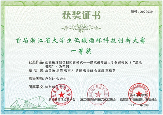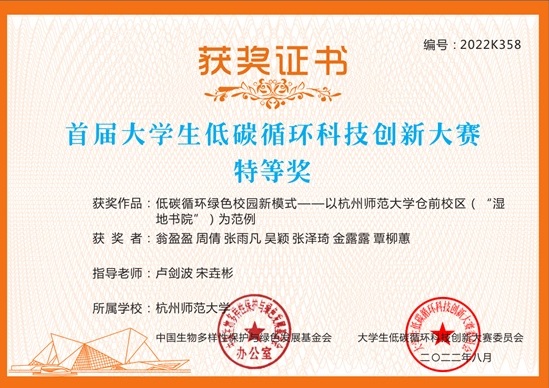 近日,首届大学生低碳循环科技创新大赛在杭州举行。我院本科生翁盈盈、周倩、张雨凡、吴颖、张泽琦、金露露和覃柳蕙等7位同学组成的“绿色空间队”从全国20余个省(直辖市、自治区)的140余所高校904个项目中突出重围,获特等奖。项目名称为“低碳循环绿色校园新模式——以无码影片 仓前校区(“湿地书院”)为范例”,指导老师为我院卢剑波教授、宋垚彬教授。