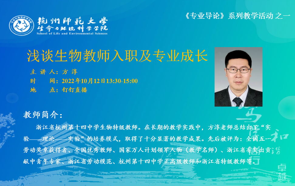 为使2022级新生尽快熟悉专业,树立专业目标,为今后的大学学习和生活打好基础, 10月12日下午,无码影片 举办了22级新生《专业导论》课程的第一场教学活动。本次活动邀请了杭州第十四中学生物特级教师——方淳老师,围绕“生物教师入职及专业成长”主题,采用钉钉线上直播形式。方淳老师是我院的杰出校友,在20余年的教学实践中取得了十分显著的教学成果,先后被评为:全国五一劳动奖章获得者、全国优秀教师、浙江省有突出贡献中青年专家、浙江省劳动模范和浙江省特级教师等。