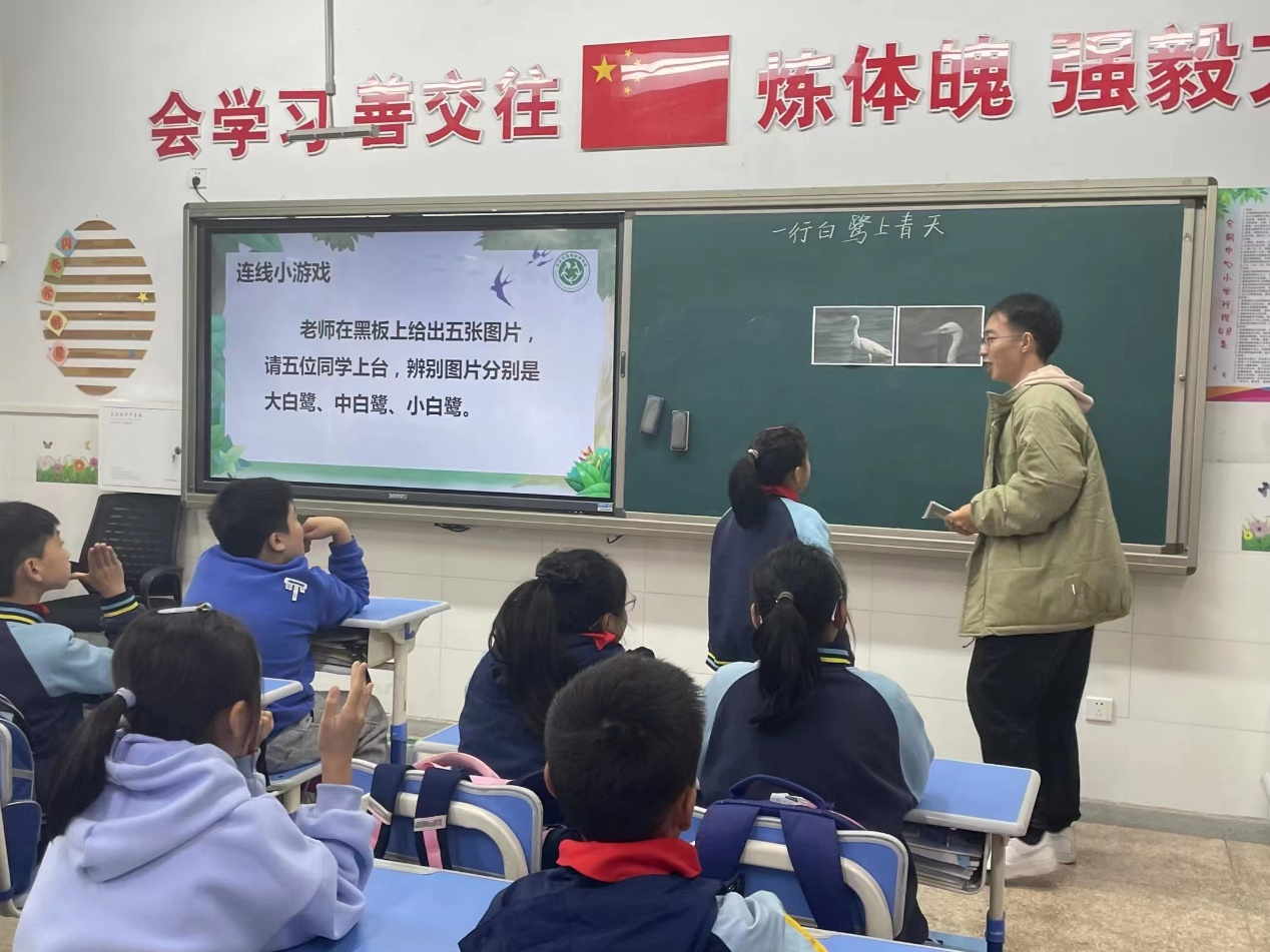 主讲同学们通过互动游戏、视频展播等形式,帮助现场生动有趣的授课方式,让同学们了解了白鹭的种类、生活习性和生长环境等方面的知识,并以如今不容乐观的环境形势让同学们认识到保护白鹭的重要性。课堂上,同学们纷纷踊跃举手发言,表现出新一代青年对环境保护的积极性和责任感。