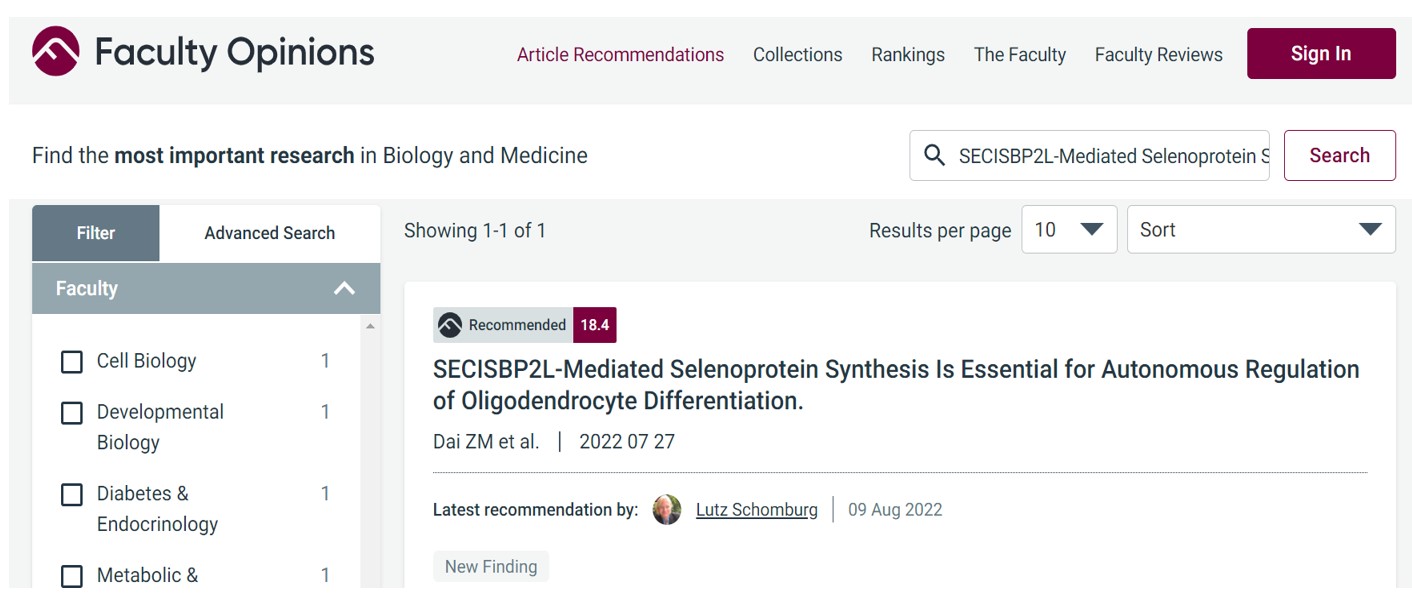 近期,我院邱猛生教授团队在少突胶质细胞(oligodendrocytes, OLs)研究方面取得了重要进展,相关成果以 “SECISBP2L-Mediated Selenoprotein Synthesis Is Essential for Autonomous Regulation of Oligodendrocyte Differentiation”为题发表在国际神经科学学会旗舰期刊《Journal of Neuroscience》。该论文因其对相关领域的重要参考价值,发表当月即引起同行高度关注,被评为杂志当期“Featured Research”,同时得到德国柏林医科大学内分泌实验研究所副主任、国际硒研究学会副主席 Lutz Schomburg教授的强力推荐,列为世界学术组织“Faculty Opinions (原F1000Prime)”推荐论文,并进行点评。