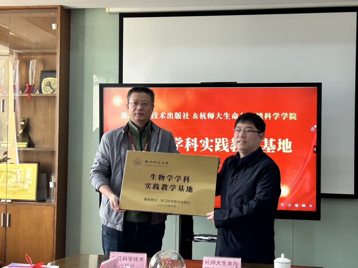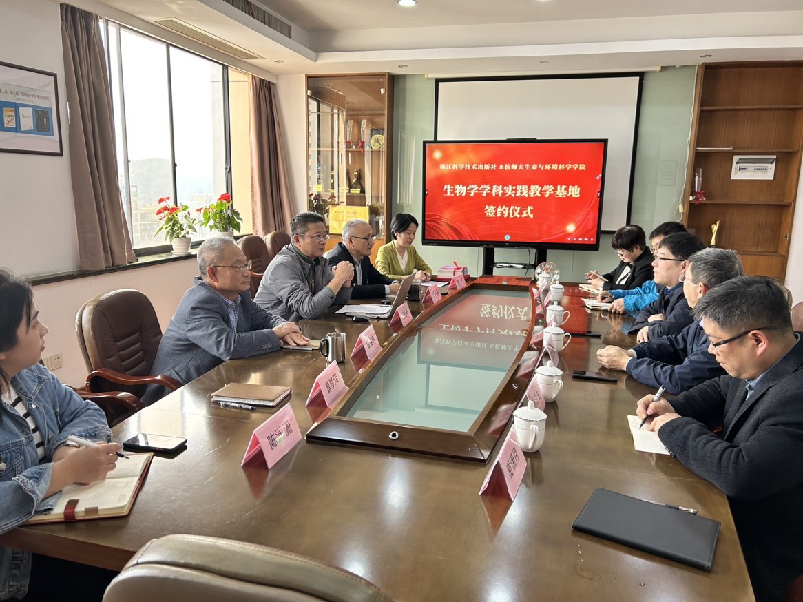 4月26日下午,无码影片 党政班子领导、生物科学系主任和相关科室主任应邀前往浙江科学技术出版社参加生物学学科实践教学基地挂牌仪式。