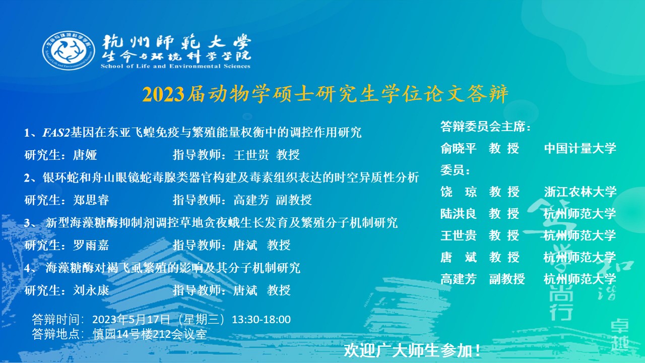 【2023届论文答辩】2023届动物学硕士研究生学位论文答辩安排