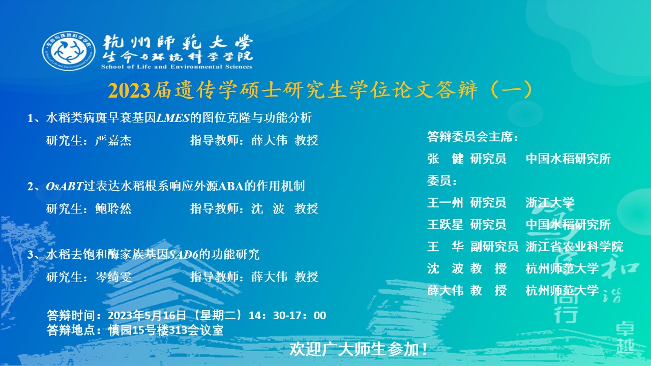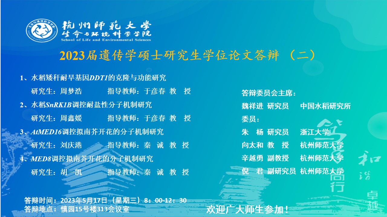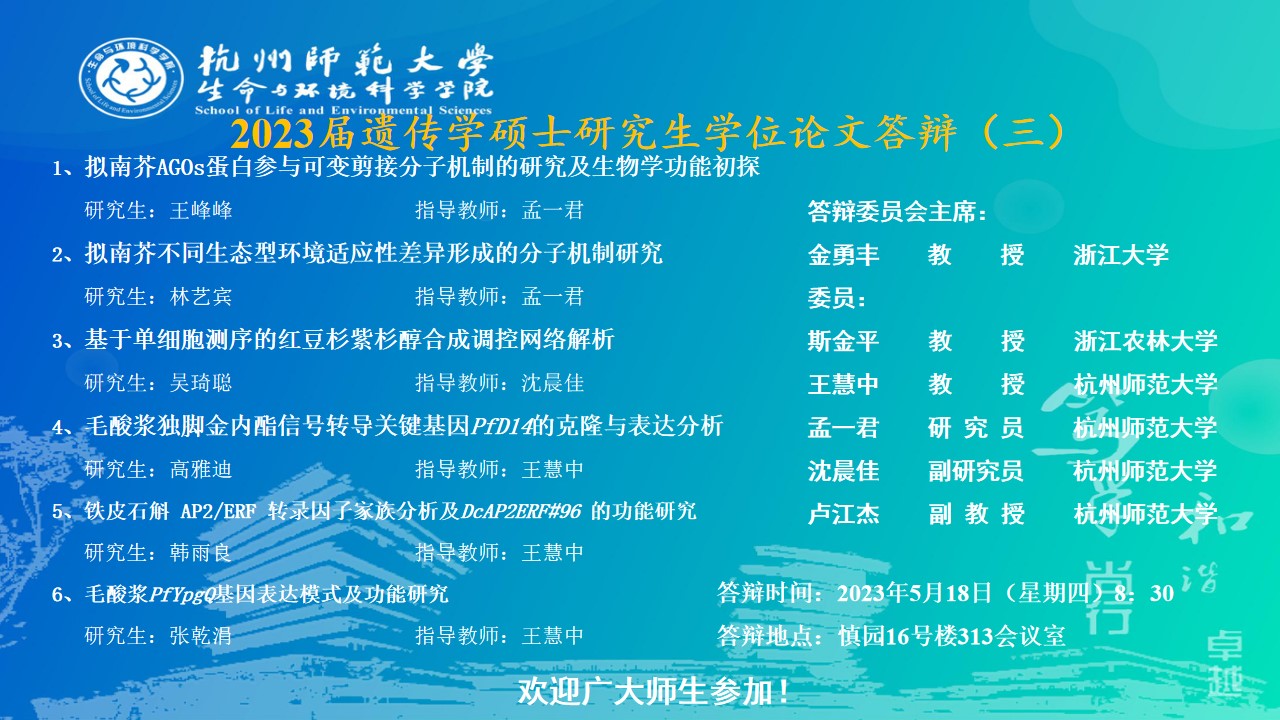 【2023届论文答辩】2023届遗传学硕士研究生学位论文答辩安排
