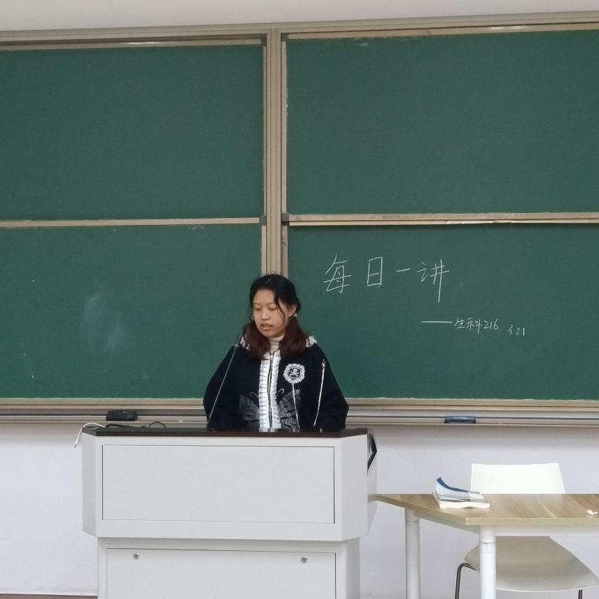 3月20日的下午,一个阳光明媚的下午,生科师范225班的全体同学们坐在下沙B号楼310教室开展了每日一讲活动,本次演讲人为俞杭荧同学。