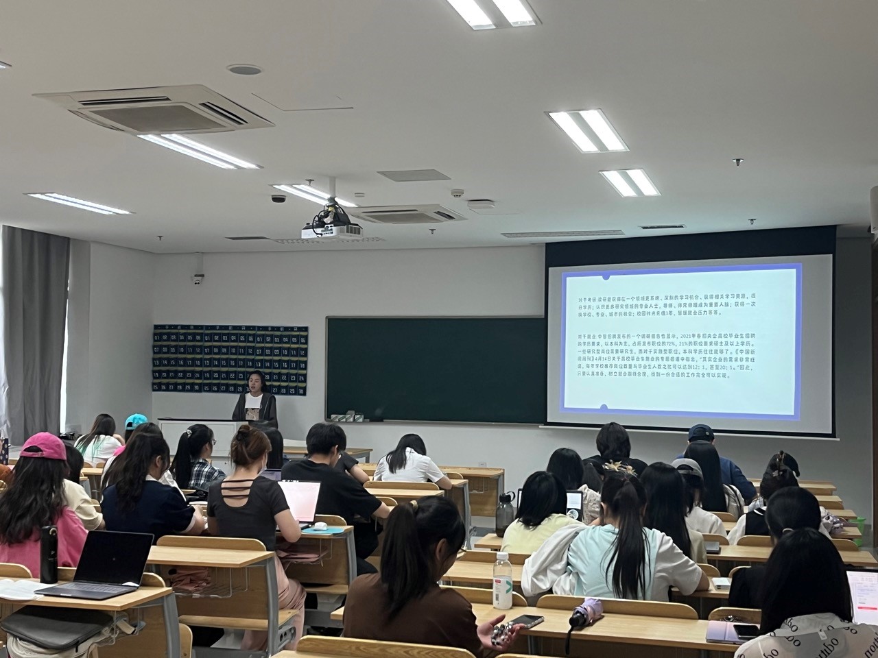 首先有生科215班团支书沈乐怡同学向同学们提出了三个问题:你想成为什么样的人?我们应该怎么做?怎样才能成为一名人民教师?并对这三个问题一一作出了解答,并且帮助同学们了解考研或考编的时间表,提醒同学们尽早准备,同时她希望同学们在做职业规划的时候,可以尊重自己的内心,顺从自己内心的选择。