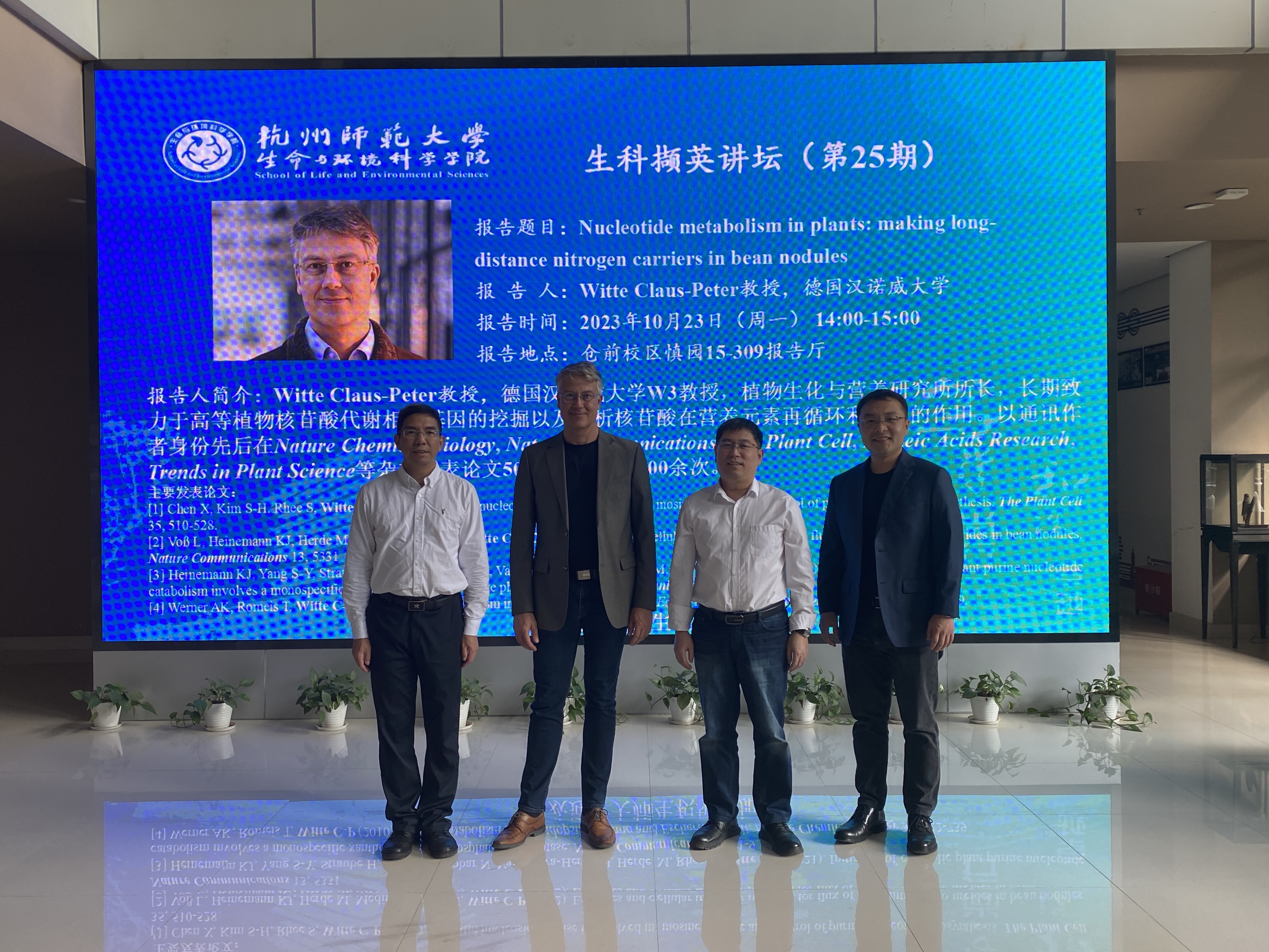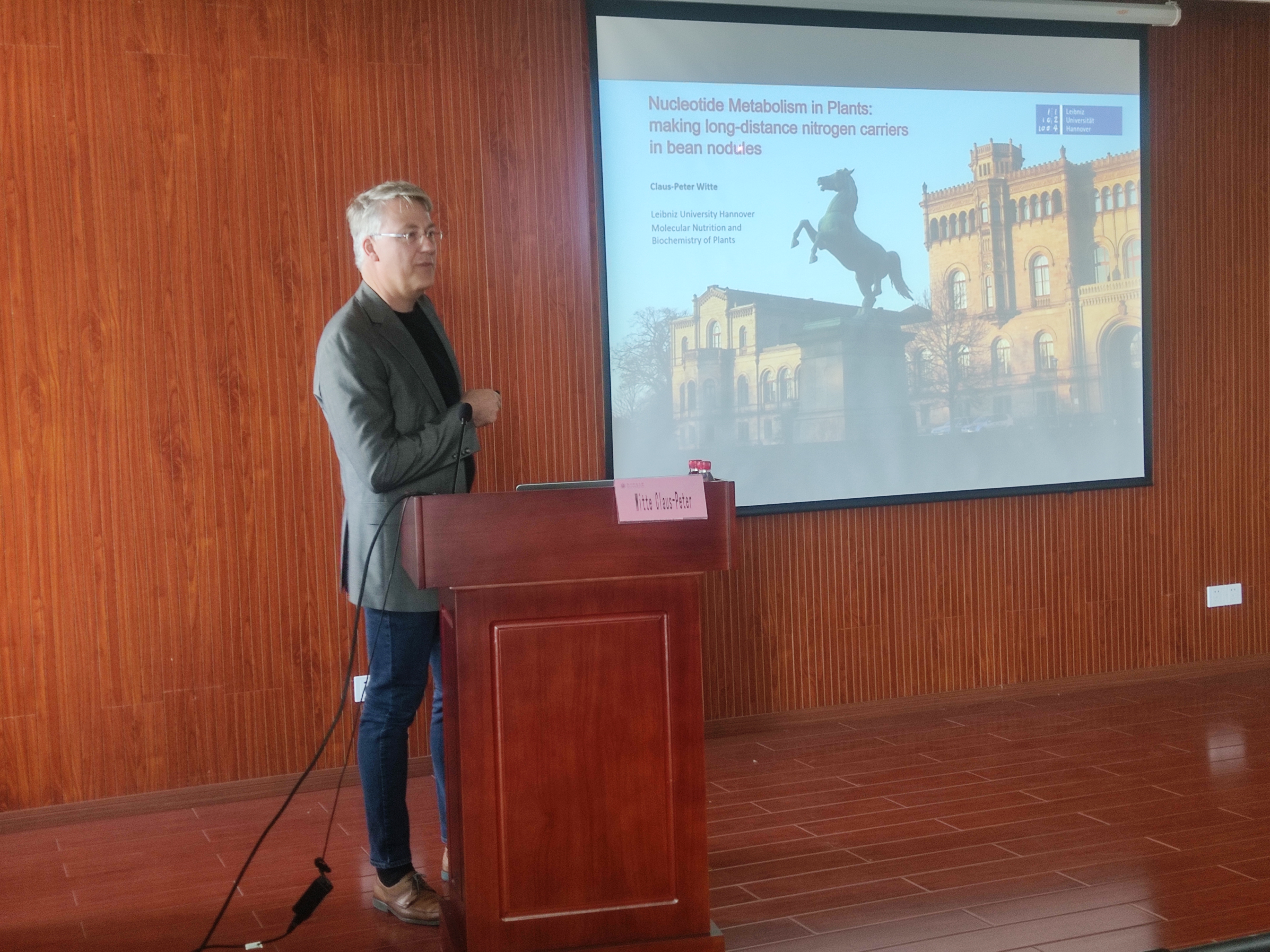 随后薛大伟院长主持了报告,生物学相关的教师和研究生踊跃参加。植物利用固氮菌合成的氨,氨在被植物同化过程中,需要在根瘤中发生长距离的氮转运,用于通过根瘤维管系统将氨输出到地上枝条组织,而这一过程涉及一些关键活性酶及细胞间的相关作用,影响固氮菌和植物营养代谢效率。在报告中,Witte教授主要以豆科植物和拟南芥为例,介绍了植物核苷酸代谢通路与生物固氮的关系。其研究团队利用生物信息学、分子生物学、生物化学和高效液相-色谱系统确定研究对象,鉴定目的蛋白的体外活性并通过定量分析相关突变体的代谢物,来解析目的基因的生物学意义。Witte教授在报告中与我院师生分享了其团队是如何在植物体内成功鉴定到核甘酸代谢通路中的关键酶,如黄嘌呤单磷酸磷酸酶(XMPP)、鸟苷转氨酶(GSDA)、质体核甘激酶I(PNK1)等。