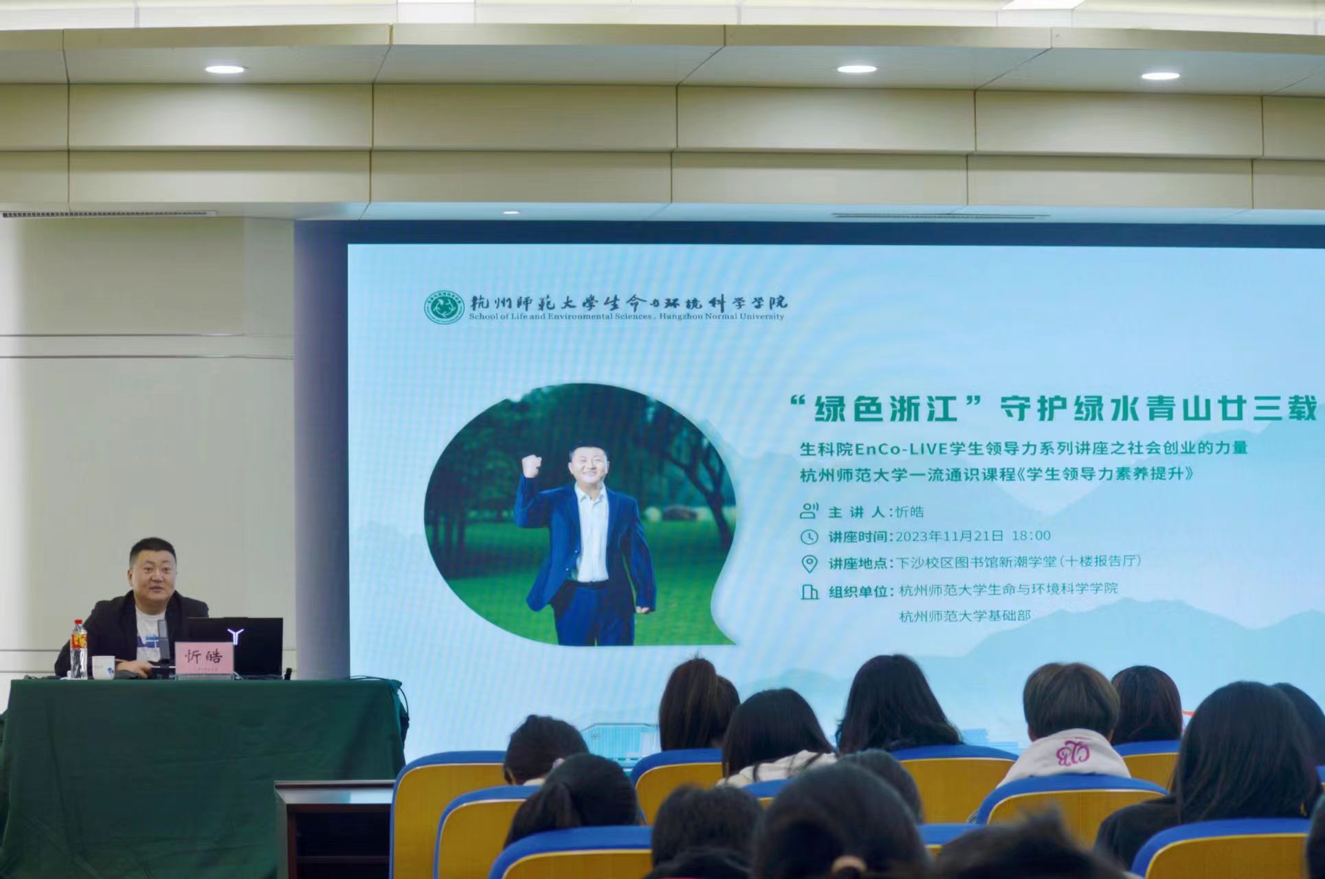 11月21日晚,无码影片 、基础部、公共管理学院联合举办EnCo-LIVE学生领导力系列讲座之社会创业的力量。浙江省科普联合会秘书长、“绿色浙江”联合创始人,社会创业者,生态文明理念传播者忻皓于下沙校区图书馆新潮学堂作“绿色浙江守护绿水青山甘三载”主题讲座。
