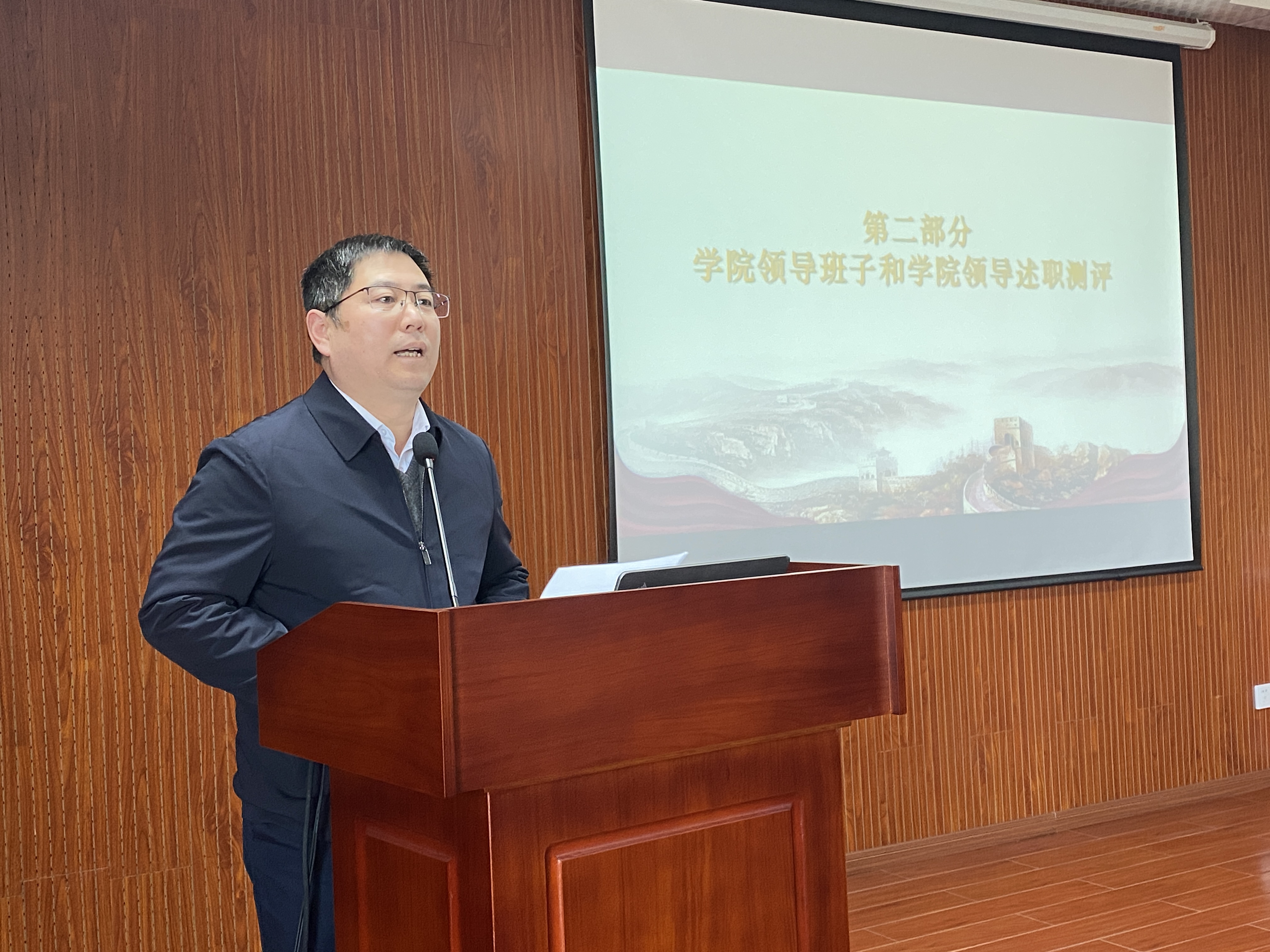 张立明书记传达了校党委组织部关于学院领导班子和学院领导述职测评工作要求。薛大伟院长代表学院班子从2023年学院工作成效、主要问题和下步打算等方面作了班子述职报告和个人工作述职报告,张立明书记作了个人述职报告,其他班子成员作了书面述职报告。根据工作程序,教师们对班子和班子成员进行了无记名投票测评。
