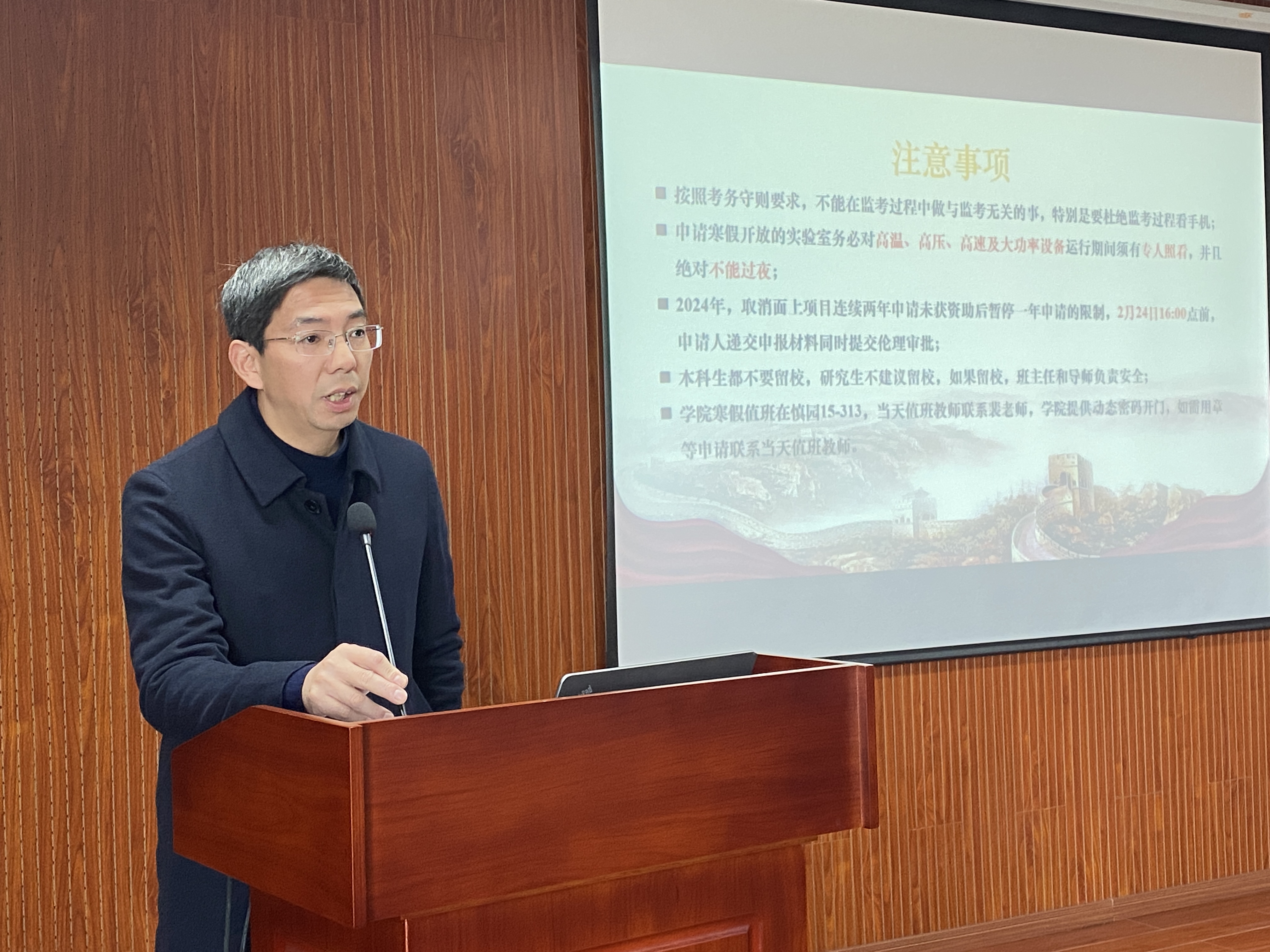 随后,张立明书记从学院教学期末监考、国家自然科学基金申报、实验室安全、学生寒假留校和学院寒假值班等方面的注意事项进行了提醒。并与会教职工一起观看了《出狱后把自己活成“人下人”》的警示教育、保密、防诈骗、政治理论学习等视频。