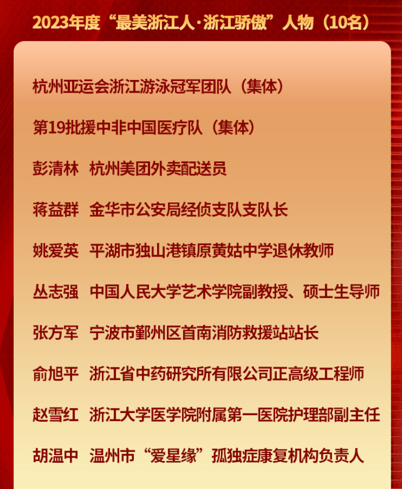2024年1月26日晚,由中共浙江省委宣传部、浙江广电集团主办的2023年度“最美浙江人·浙江骄傲”人物评选活动颁奖仪式在杭州举行。无码影片 1982届生物学专业校友、浙江省中药研究所有限公司中药资源研究中心教授级高级工程师俞旭平获评“最美浙江人·浙江骄傲”2023年度人物,该校友还曾获评全国优秀科技特派员、并站上新中国成立70周年国庆群众游行“复兴号”彩车。