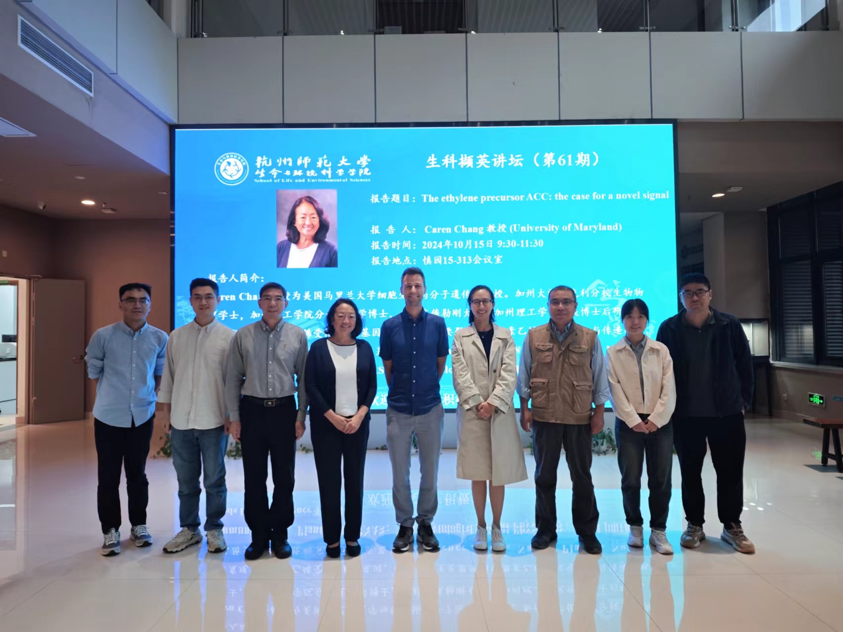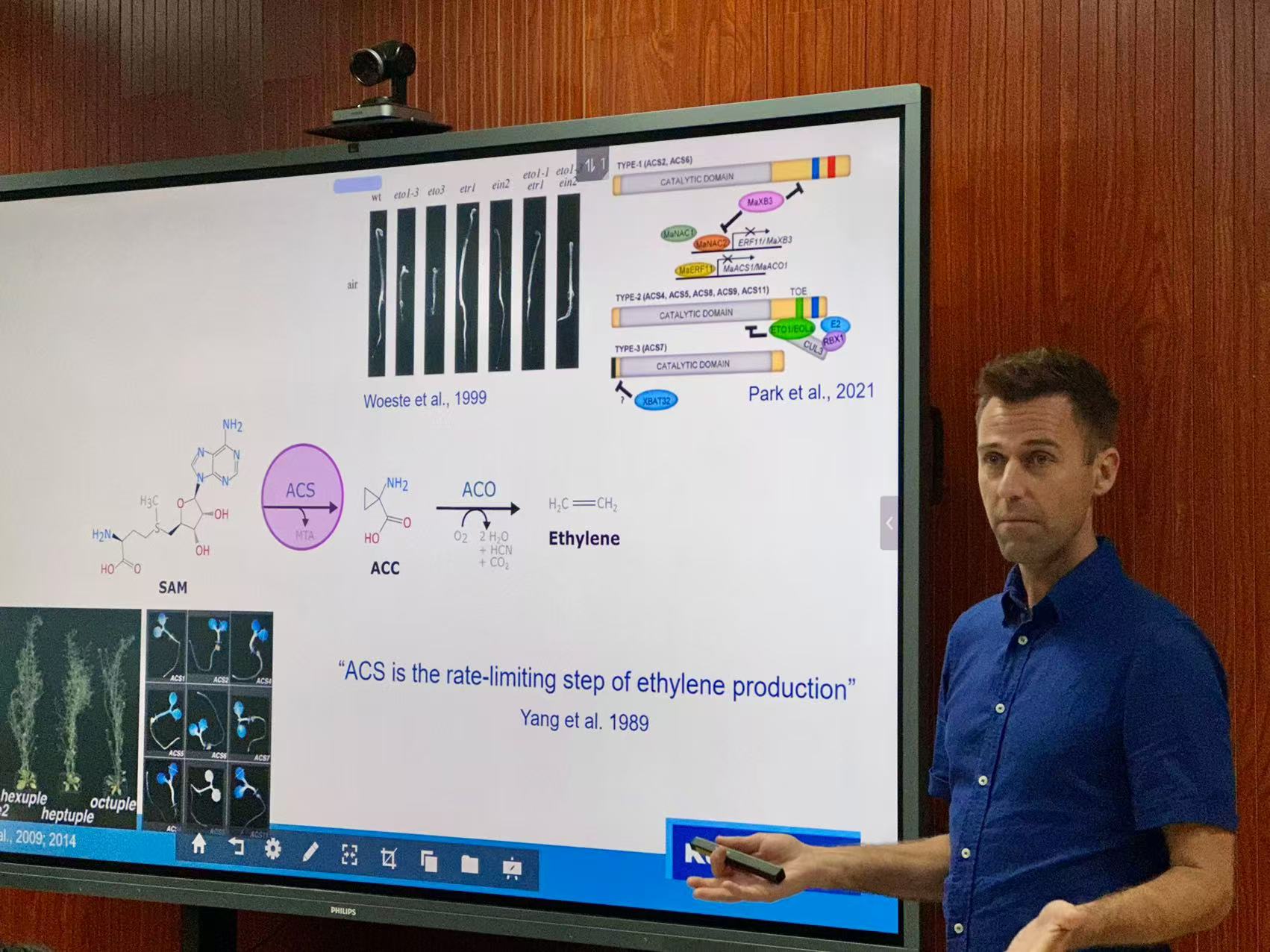 报告中,美国马里兰大学Caren Chang教授首先做了题为《The ethylene precursor ACC: the case for a novel signal》的报告。她分别从植物激素乙烯信号在植物进化过程中的保守功能研究、乙烯合成前体ACC在低等植物地钱中独立于乙烯的生理调控作用,以及ACC在高等植物拟南芥中调控胚珠对花粉管吸引的分子机制这三个方面详细介绍了其团队近年在探究ACC可能作为一种独立于乙烯的新型信号分子对植物的调控功能。随后,比利时鲁汶大学Bram Van de Poe教授做了题为《The role of ACC-oxidase in directing ethylene production and its regulation by low-oxygen stress》的报告。他首先介绍了其团队近年来对拟南芥乙烯合成关键酶ACO基因家族系统性的功能研究、ACO基因对不同环境胁迫的响应、以及在低氧胁迫下关键转录因子ERFVII对ACO转录调控的分子机制。