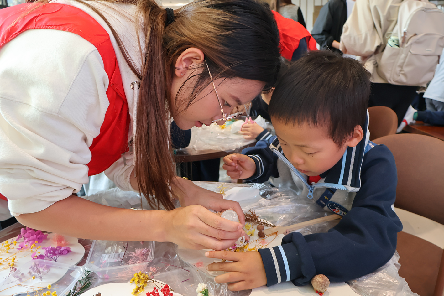 在参观结束后,小朋友们返回慎15大厅制作花扇。他们运用所学的花卉知识,挑选色彩鲜艳的花瓣和绿叶,亲手设计并制作出花扇,不仅锻炼了动手能力,还加深了对美的理解和创造。
