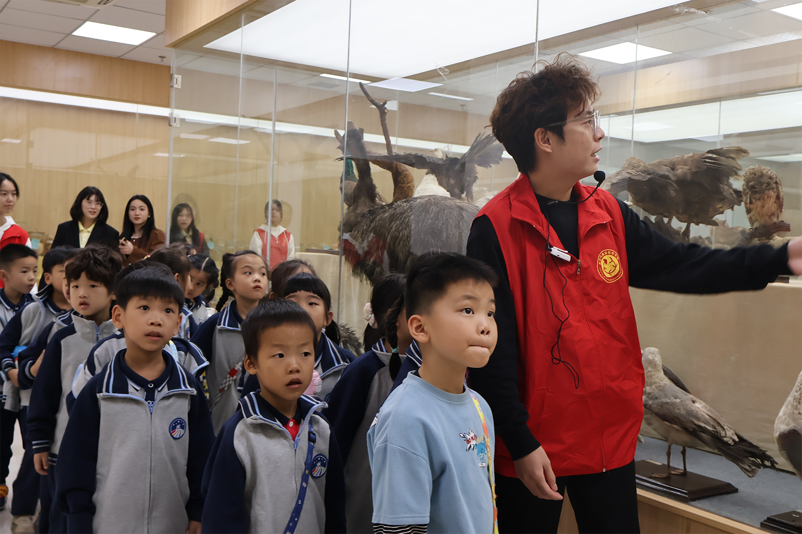 随后,活动进入了一个全新的阶段——动物标本馆的参观。小朋友们近距离观察了各种动物标本,志愿者老师们则在一旁耐心讲解,使小朋友们对动物的生态习性、进化历程以及保护现状有了更直观的认识,进一步拓宽了他们的视野。