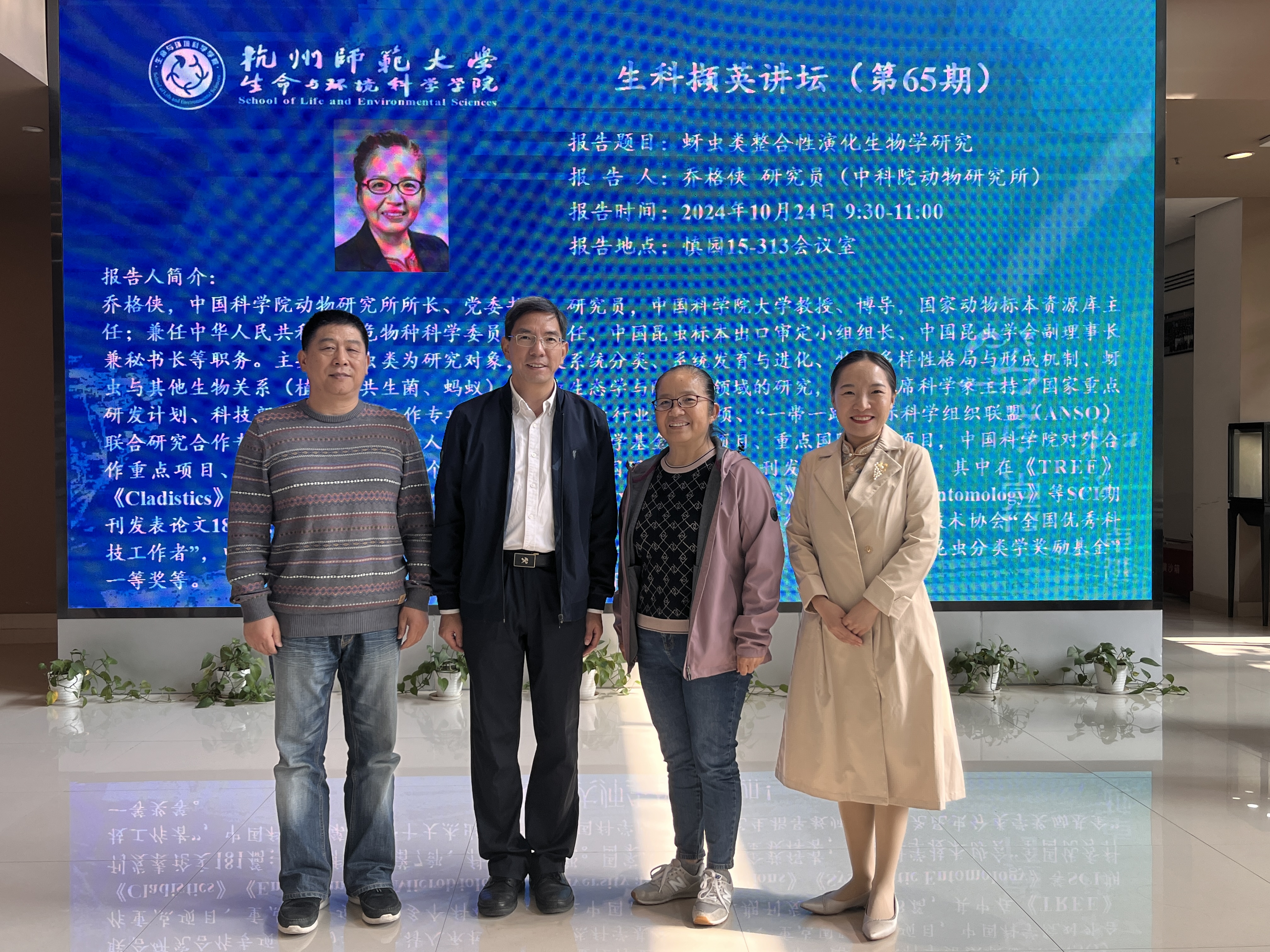 10月24日,中国科学院动物研究所所长、党委书记乔格侠研究员应邀访问我院并做学术报告。本次报告会,乔格侠研究员作了题为“蚜虫类整合性演化生物学研究”的学术报告,从传统的形态分类到DNA条形码,从线粒体基因组到全基因组,从蚜虫个体性状到虫瘿特征及内生菌构成,构建了蚜虫—内生菌—寄主植物的整合性生物演化体系,阐明了蚜虫与内外环境的协同演化规律。乔格侠研究员还跟学生分享了自己的科研历程,鼓励研究生要明确自己的研究目标,坚持不懈地走下去。报告会后,学院党委书记张立明向乔格侠所长介绍了学院的发展历史及学科建设等情况,参观了我院标本馆及实验室、大型仪器共享平台等,王倩副书记陪同参观。